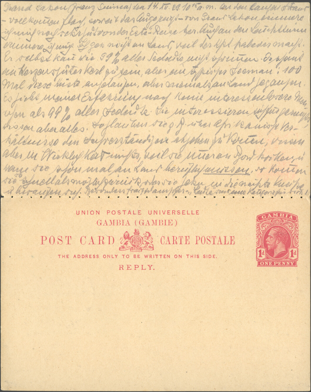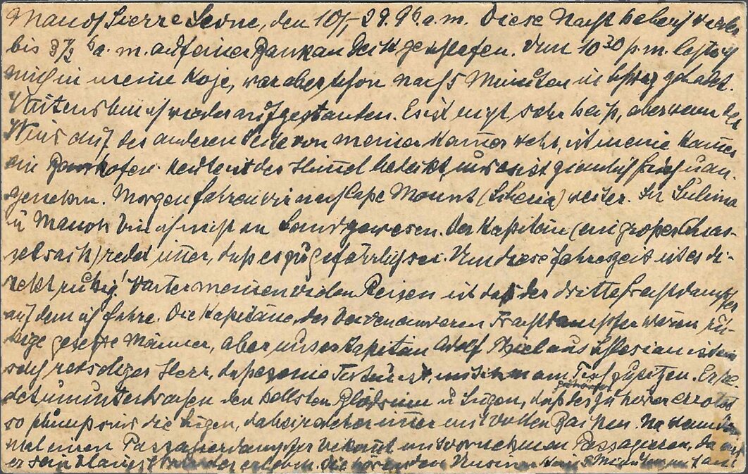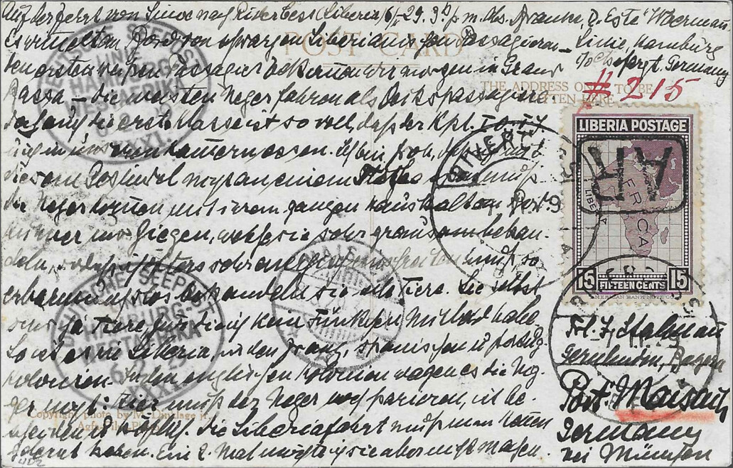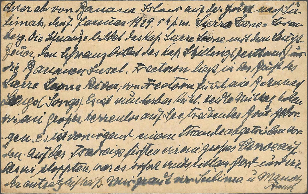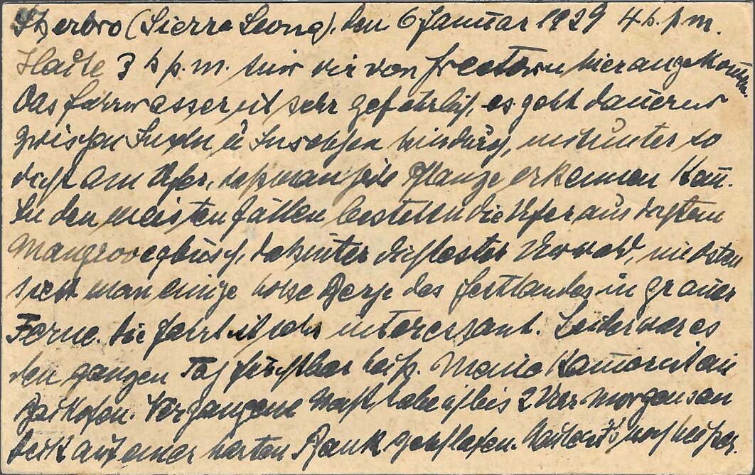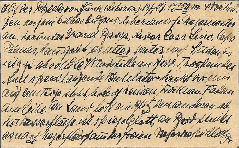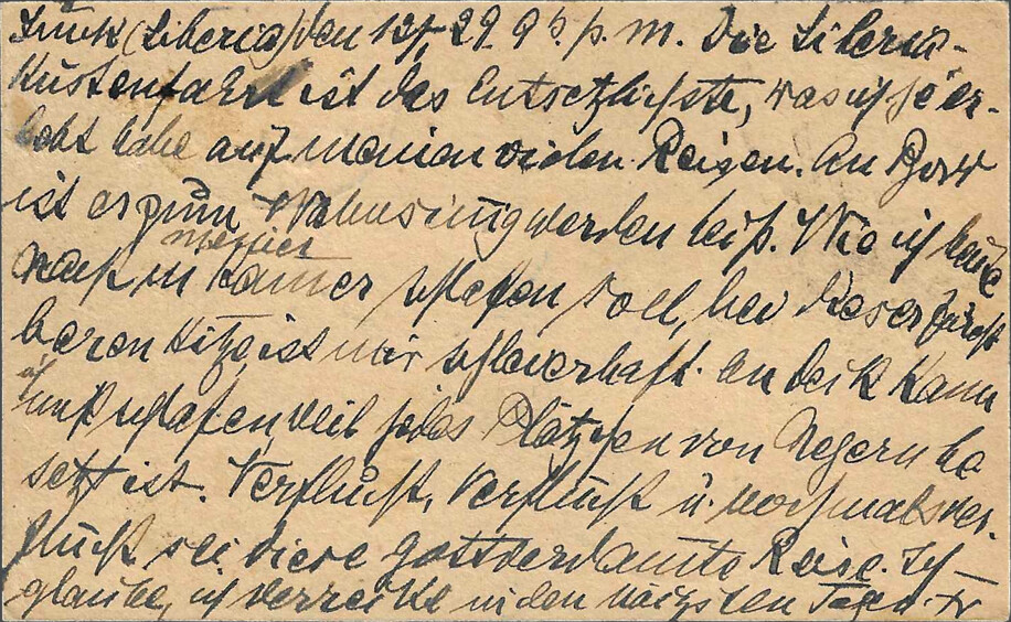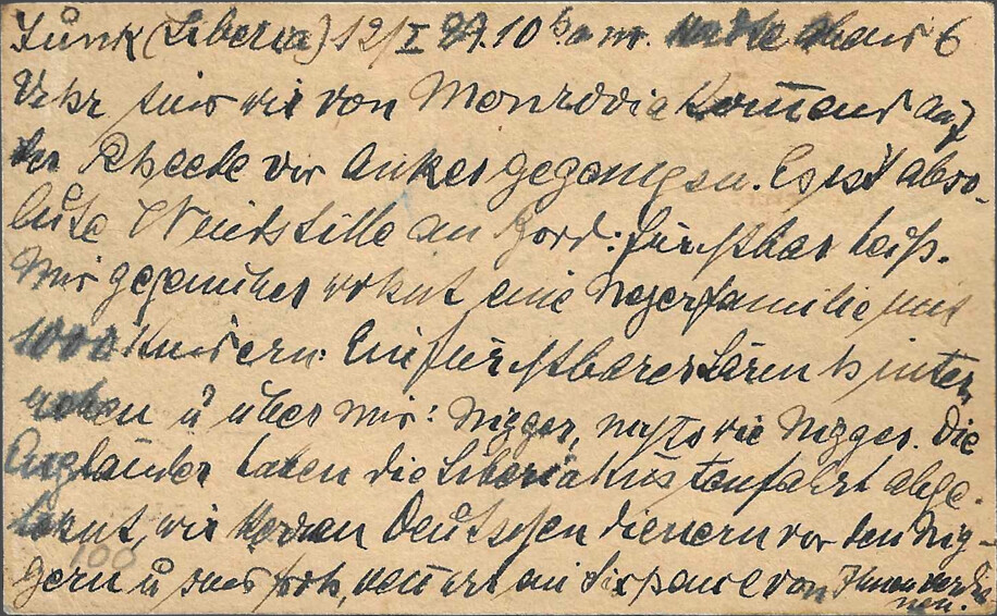 Sasstown (Liberia), 5 February 1929, 6 p.m. Sender Dr. Franke, ship’s doctor SS “Este,” c/o Chief Medical Officer of the Woermann Line, Hamburg, GermanyI was ashore from 2 p.m. to 3:30 p.m. The ship is lying far from land. Huge boulders lie off the beach, scoured by the high seas. The landing craft has to navigate between these boulders. At this time of year, it’s not very dangerous, but when the seas are rough, this is the most dangerous place for mail that I know on the west coast, and I know the coast quite well from my numerous sea voyages. There is no post office in Sasstown, just as there is no post office in Grand Cess. At least, that’s what the damned nigger “customs officers” said at both places. They probably lost the handstamps due to the indescribably sloppy conditions that prevail in the Negro Republic of Liberia. It’s a [chimaera?] that Liberia is “free and independent.” Damn nigger vermin!!