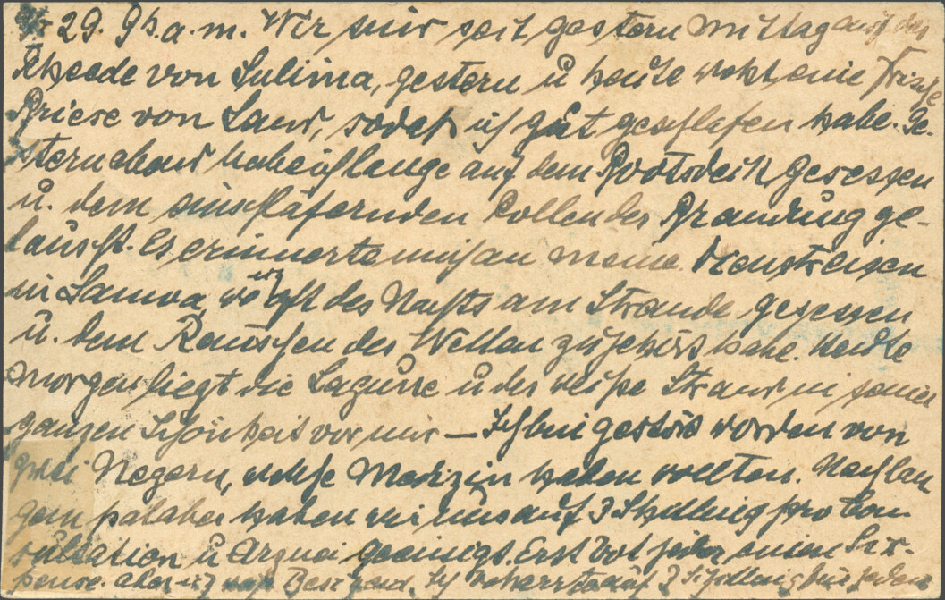9/I 29. 9 h a.m. Wir sind seit gestern mittag auf der Rheede von Sulima, gestern u. heute weht eine frische Briese von Land, sodaß ich gut geschlafen habe. Ge- stern abend habe ich lange auf dem Bootsdeck gesessen u. dem einschläfernden Rollen der Brandung ge- lauscht. Es erinnerte mich an meine Dienstreisen in Samoa, wo ich of des Nachts am Strande gesessen u. dem Rauschen der Wellen zugehört habe. Heute morgen liegt die Lagune u. der weiße Strand in seiner ganzen Schönheit vor mir – Ich bin gestört worden von zwei Negern, welche Medizin haben wollten. Nach lan- gem Palaber haben wir uns auf 3 Schilling pro Con- sultation u. Arznei geeinigt. Erst bot jeder einen Six- pence, aber ich wußte Bescheid. Ich beharrte auf 3 Schilling für jeden.