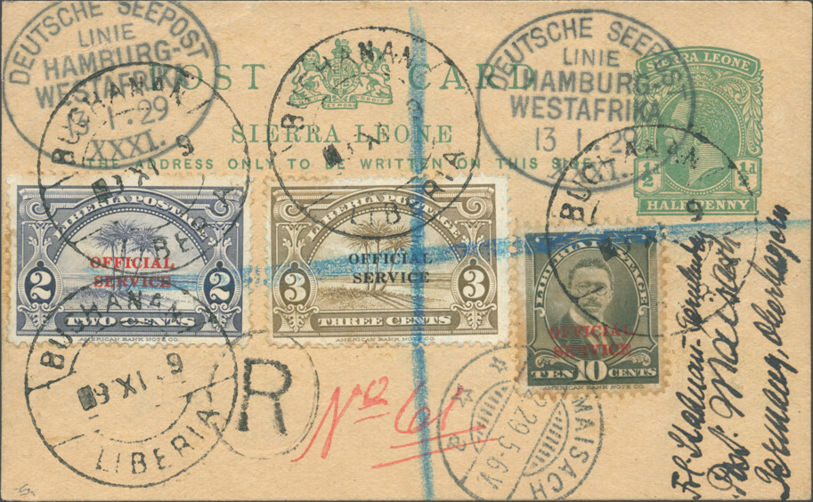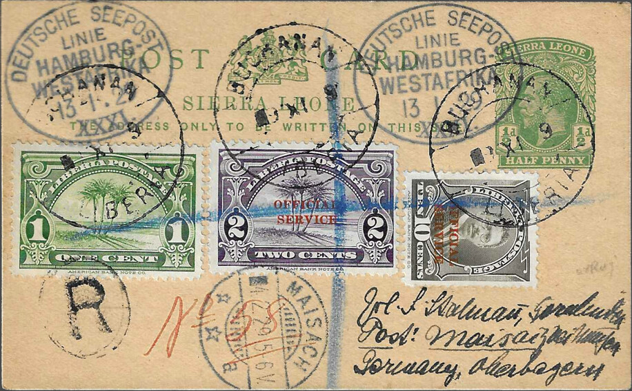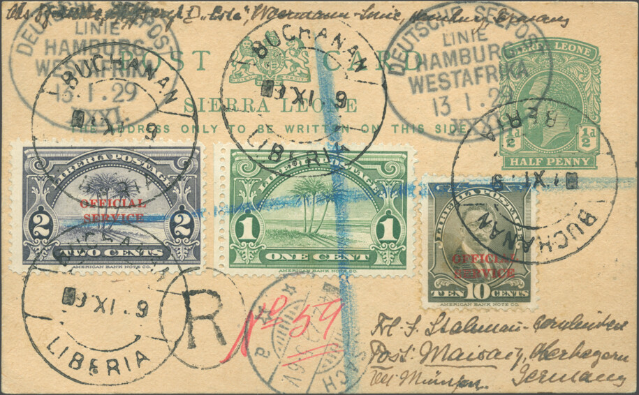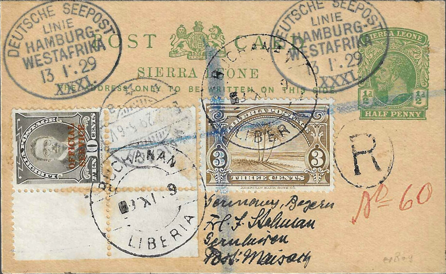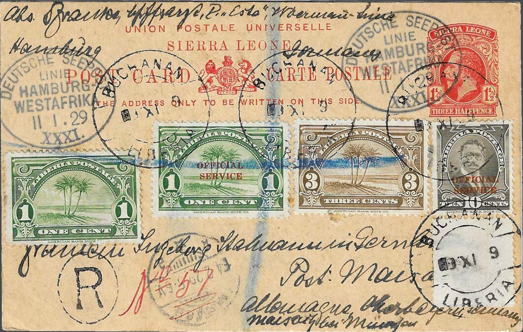 Sierra Leone 1½ pence postal card postmarked SEEPOST 11 January 1929, with additional Liberian stamps (15 cents) cancelled and registered in Buchanan on 14 January, arrived in Maisach on 4 February.