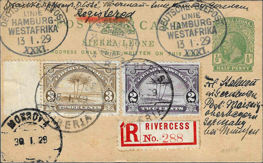 Sierra Leone 1½ pence postal card postmarked SEEPOST 11 January 1929, with additional Liberian 5 cents stamp cancelled and registered in Rivercess on 28 January, arrived in Maisach on 25 February.
