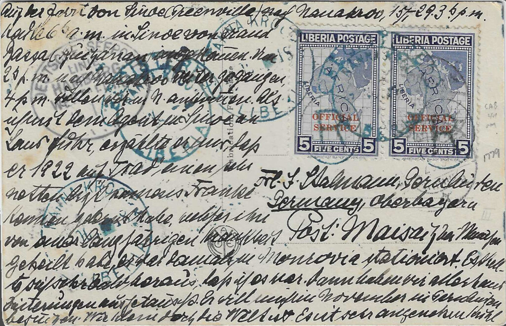 Picture postcard postmarked SEEPOST 6 February 1929, franked with a Liberian stamp (15 cents) cancelled and registered 7 February in Rivercess, arrived in Maisach on 8 March.