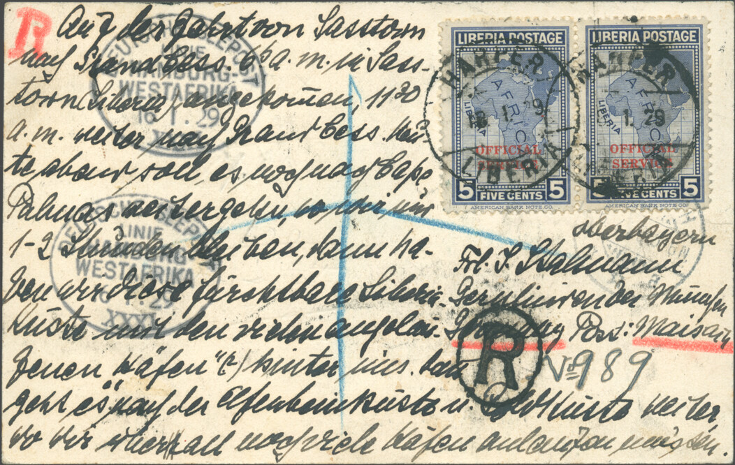 Picture postcard postmarked SEEPOST 6 February 1929, franked with Liberian stamps (13 cents) cancelled and registered 7 February in Rivercess, arrived in Maisach (likely on 8 March).
