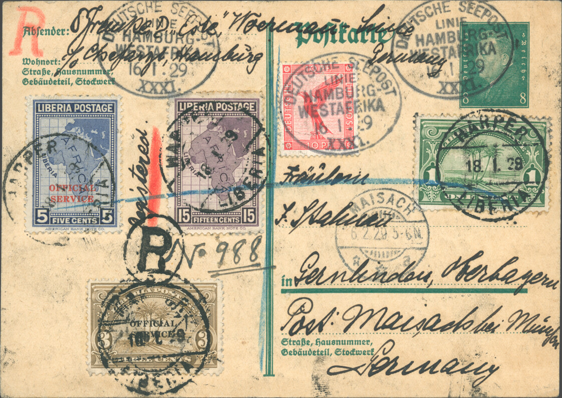 German 8 pfennigs postal card postmarked SEEPOST 16 January 1929, with additional German 10 pfennigs airmail stamp and Liberian stamps (24 cents) cancelled and registered in Harper on 18 January, arrived in Maisach on 6 February.