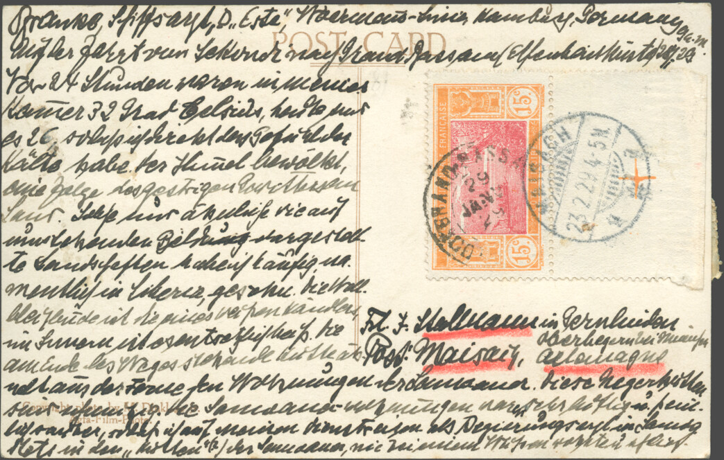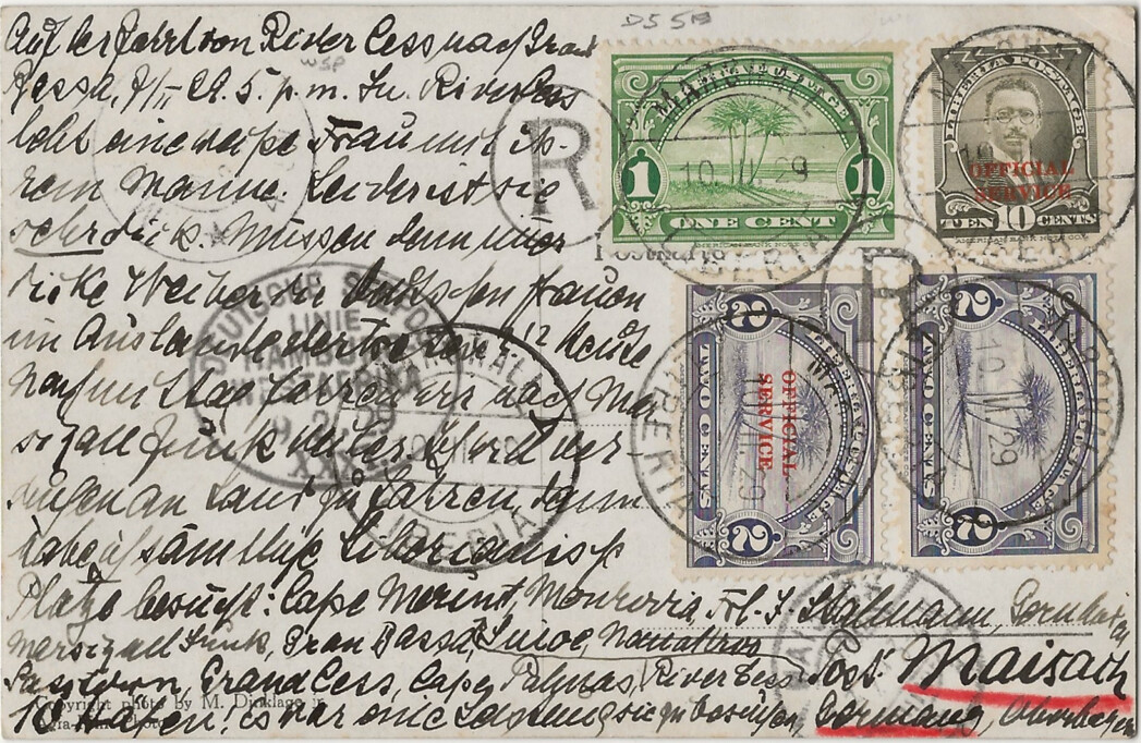 Written on 6 January, Dr. Franke only handed this postcard over to the purser five days later, on 11 January – apparently too late to be passed on to a post office in Sierra Leone. It seems it was not handed back to him immediately, because the ship had already passed several ports in Liberia when the card, now supplemented with a Liberian 5c stamp (on top of the SEEPOST cancel), was posted registered in Rivercess. Apparently, the local postal clerk accepted cash as payment for registration.
