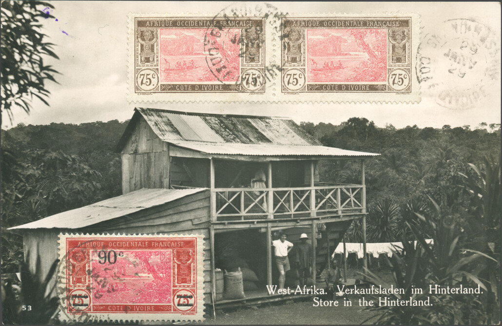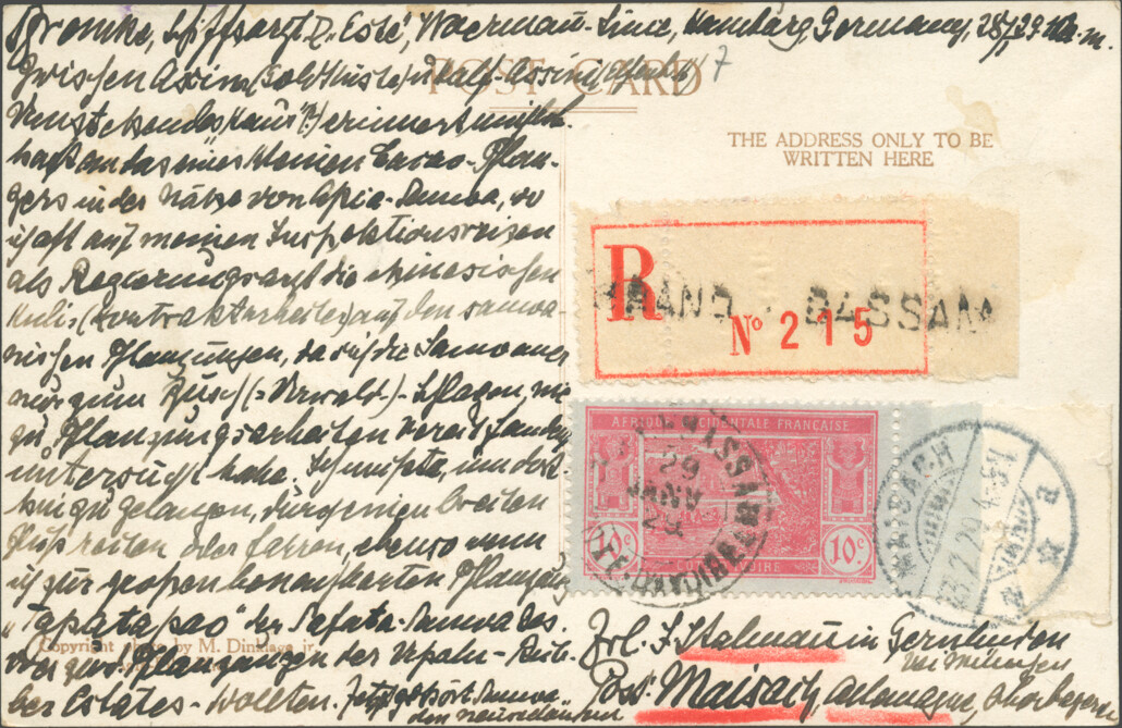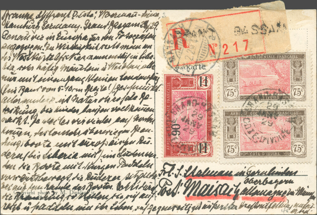 Picture postcard franked with French Ivorian stamps (2 francs 50 centimes) cancelled and registered 29 January 1929 in Grand Bassam, arrived in Maisach on 23 February.