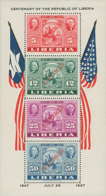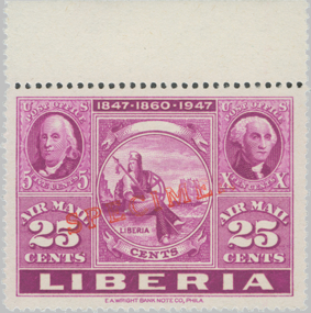 This page contains a loose collection of essays, proofs and specimens of Liberian stamps issued through 1960. About the terminology: essays either show stamp designs that were never used or designs that were used but altered for the final stamp; proofs, whether taken from the whole plate or directly from the single die, always show the final design or parts of it – but often in a different “trial” color and printed on different paper, e.g. cardboard – however, they can also have gum and be perforated like a normal stamp; specimens are the finished stamps as issued, but with overprint to indicate they are meant for distribution to postal authorities or sent as examples to the Universal Postal Union. From this it should be clear that the “Waterlow specimens” of the first pictorial issue printed in trial colors are really proofs.