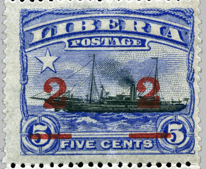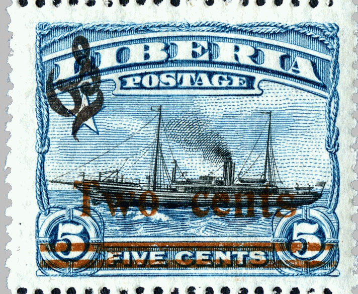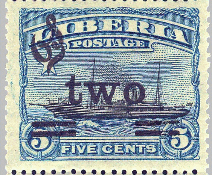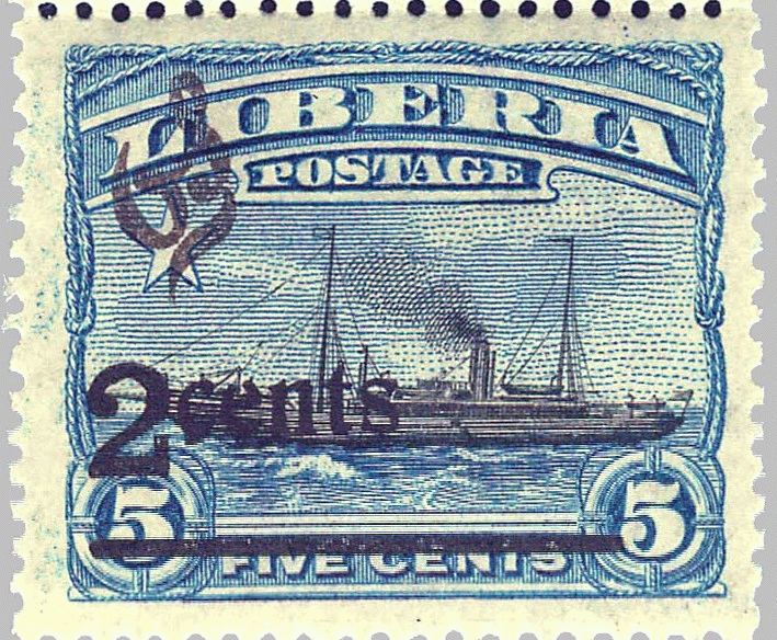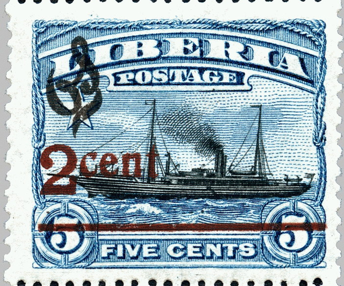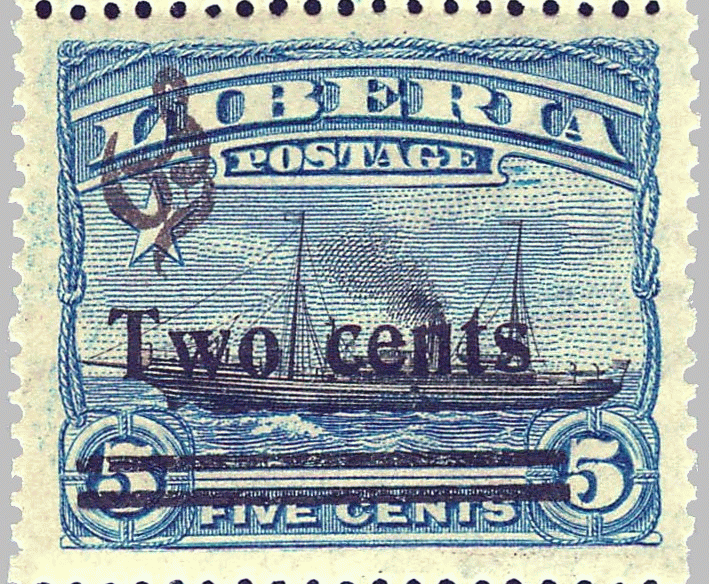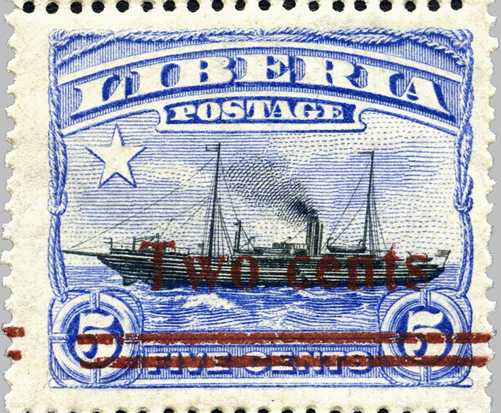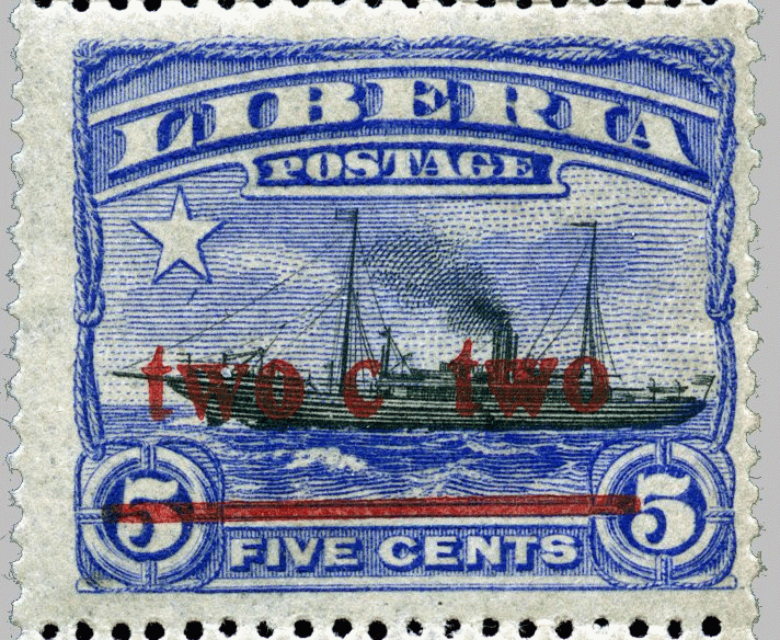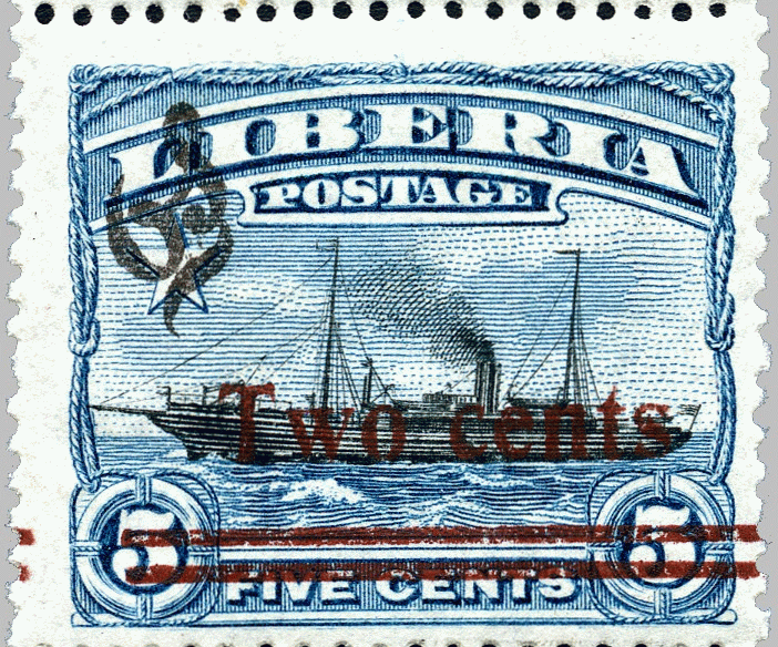 Errors often creep in when stamps are surcharged, but the mistakes usually make the stamps rarer. In this case, taking for example the 5 cents ultramarine and black, show a picture of the Liberian gunboat "Lark," each sheet of 100 stamps contains "errors." Each stamp in the top row of ten bears the red surcharge "Two Cents" with a long red line under it. On each stamp in the second row there are two lines instead of one. The fourth row bears "Two Cts" upside down on each stamp. The eighth row shows 2 2, each figure having a short line under it. The surcharges on the other five rows are all different.