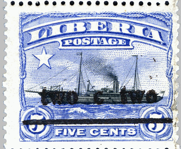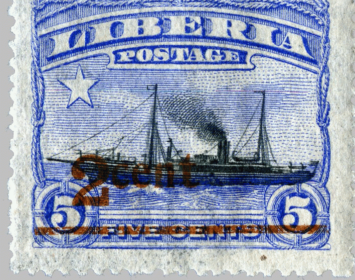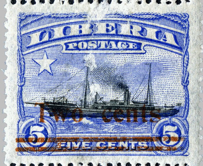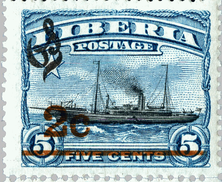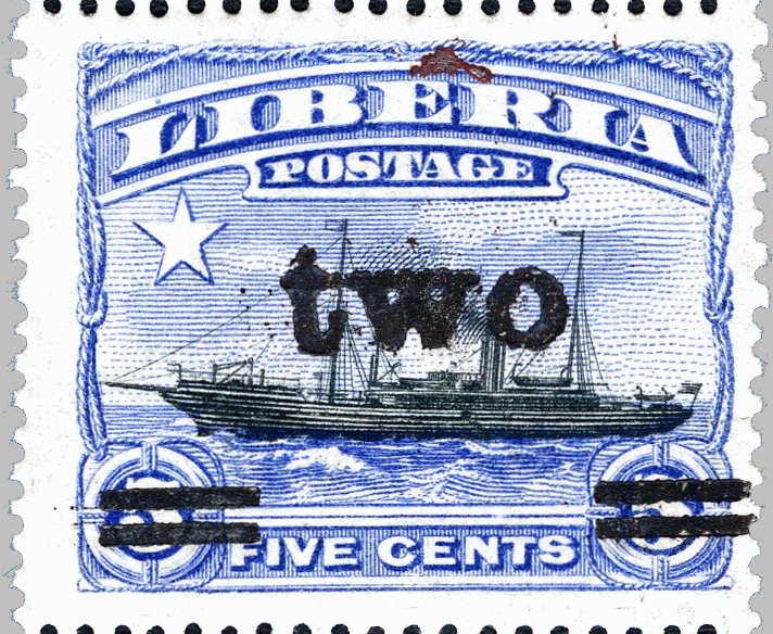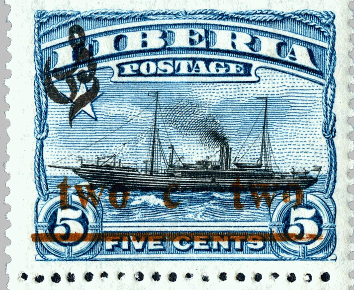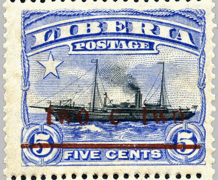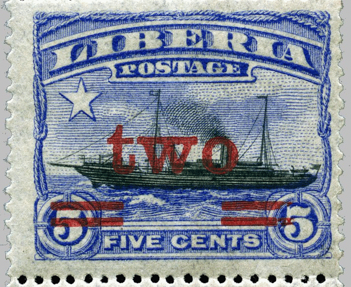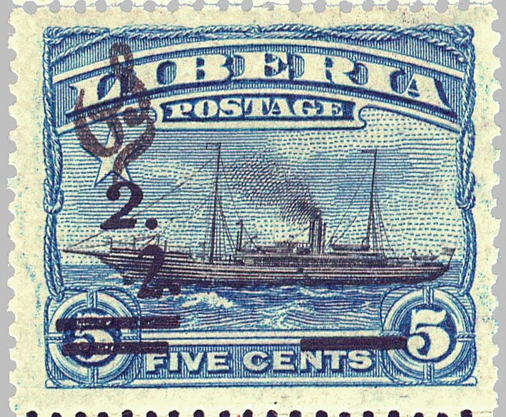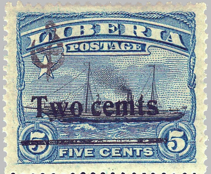 Errors often creep in when stamps are surcharged, but the mistakes usually make the stamps rarer. In this case, taking for example the 5 cents ultramarine and black, show a picture of the Liberian gunboat "Lark," each sheet of 100 stamps contains "errors." Each stamp in the top row of ten bears the red surcharge "Two Cents" with a long red line under it. On each stamp in the second row there are two lines instead of one. The fourth row bears "Two Cts" upside down on each stamp. The eighth row shows 2 2, each figure having a short line under it. The surcharges on the other five rows are all different.