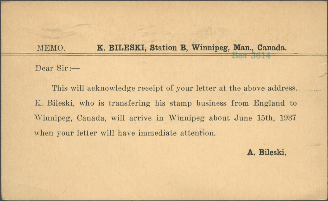 As for when he returned to Canada, a Linn's Stamp New article states: "By 1937, the homesick couple returned to Canada, settling in Winnipeg, where they built a house and small office and set up their mail-order stamp trade."