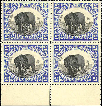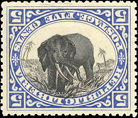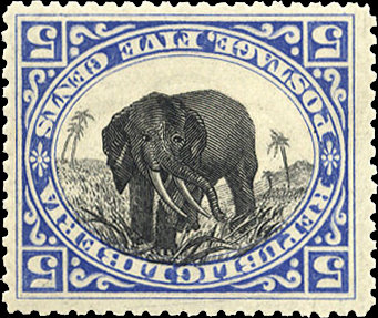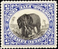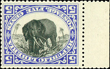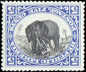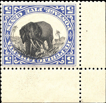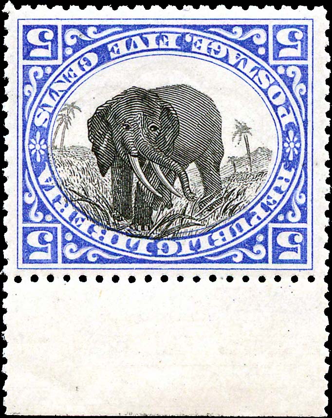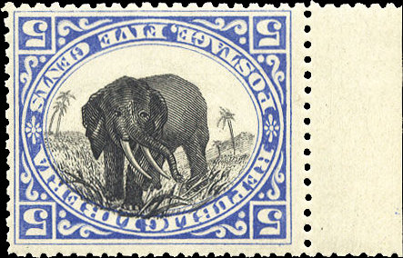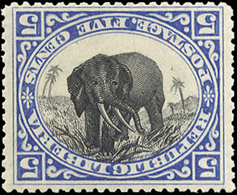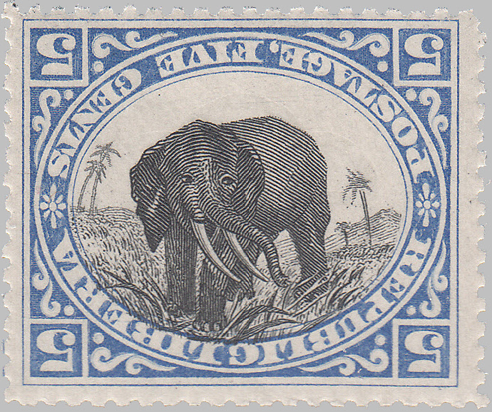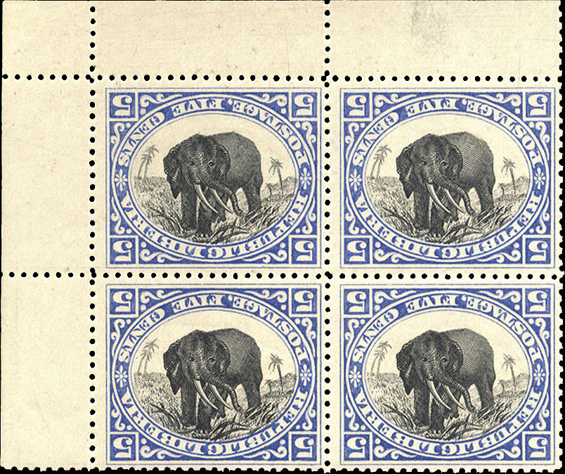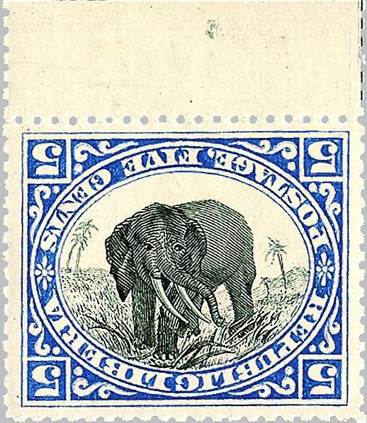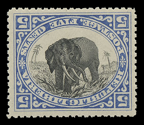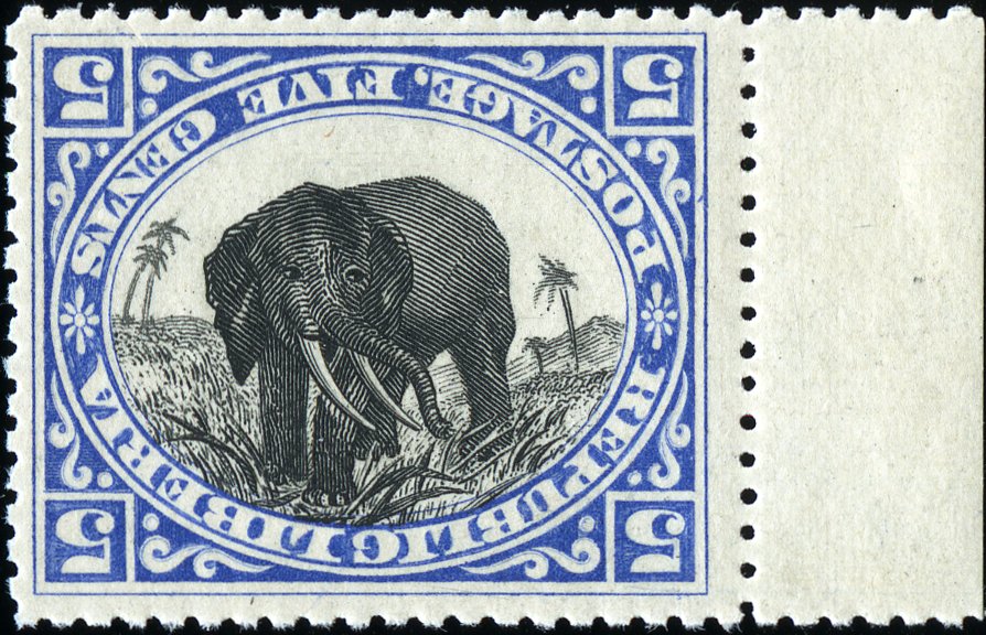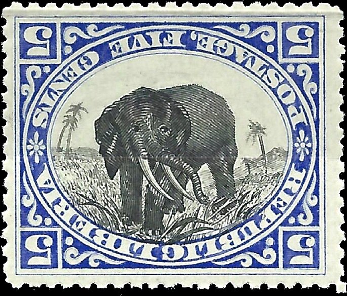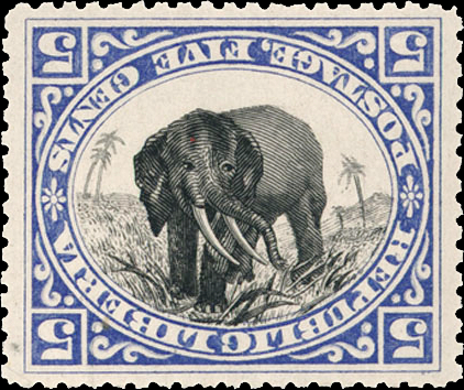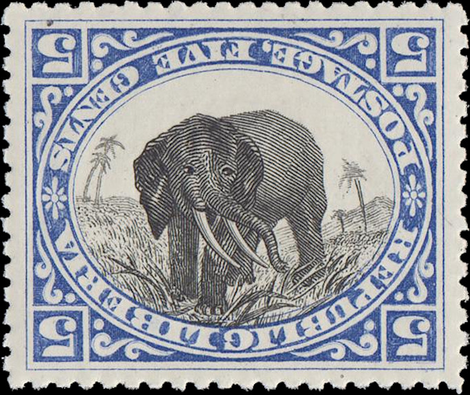 This is an attempt to reassemble “in silico” the only known sheet of one of Liberia’s most wanted errors, the 5c ultramarine and black definitive stamp of 1905 with the elephant vignette being inverted relative to the frame. While it’s not the only inverted elephant Liberia has to offer, it is by far the rarest. Listed in Scott as number 62a, this stamp was effectively unavailable to collectors for many decades until 1973 when the sheet was purchased and broken up by the well known Canadian dealer Kasimir Bileski.