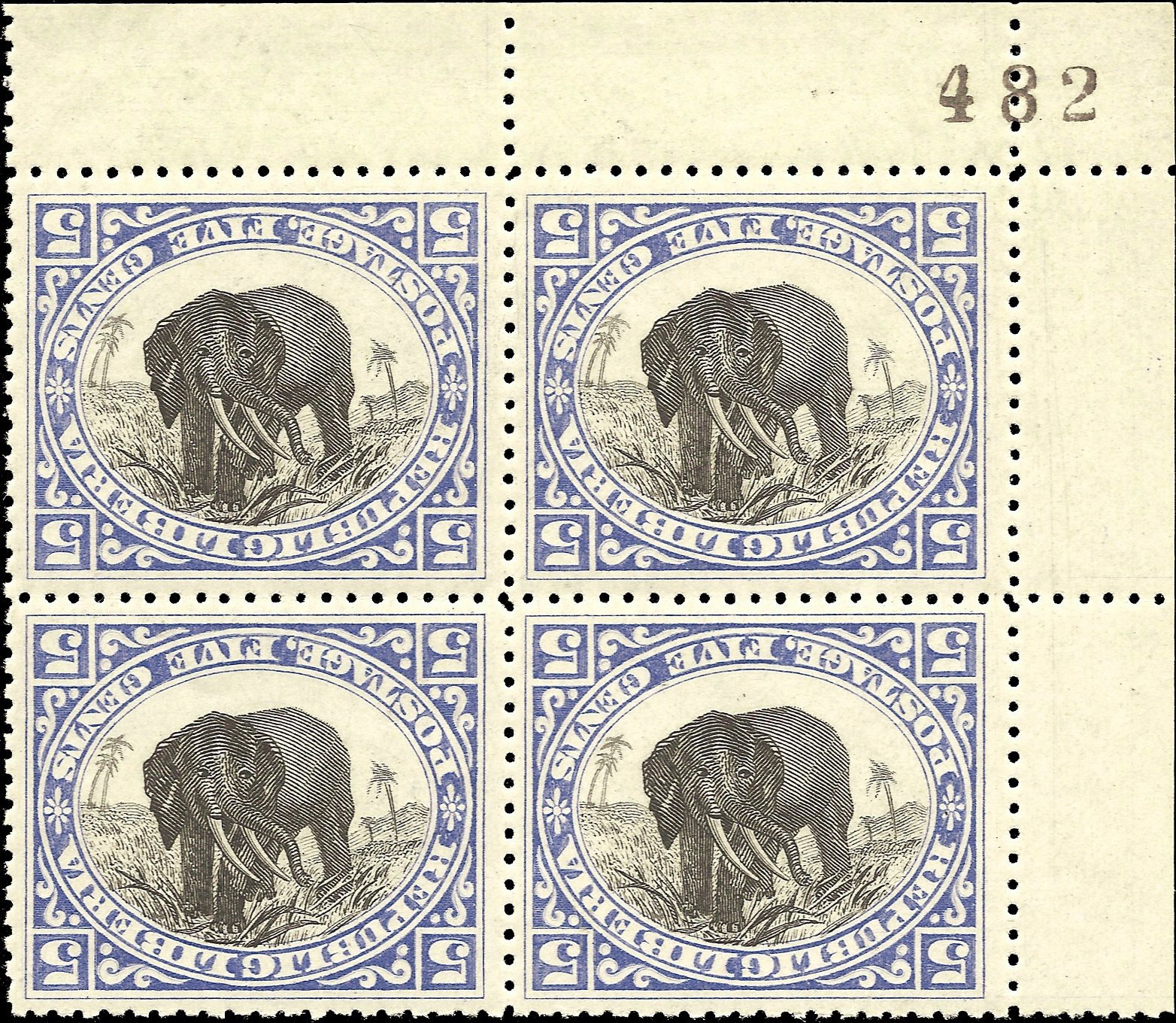 Just one exception. There was a collector who had the entire sheet of 60 of the error, all that were ever found. It is not known when it was discovered, very likely soon after it was printed in 1905 by the great English firm of Waterlow and Sons, but for certain it was a genuine printing error found in the postal stocks. The sheet still has the number 482 which means it was the 482nd sheet to be numbered. The renowned dealer, Philip Ward Jr. acquired and sold it intact to a specialist in Liberian stamps and the sheet has remained in this collection for very many years.