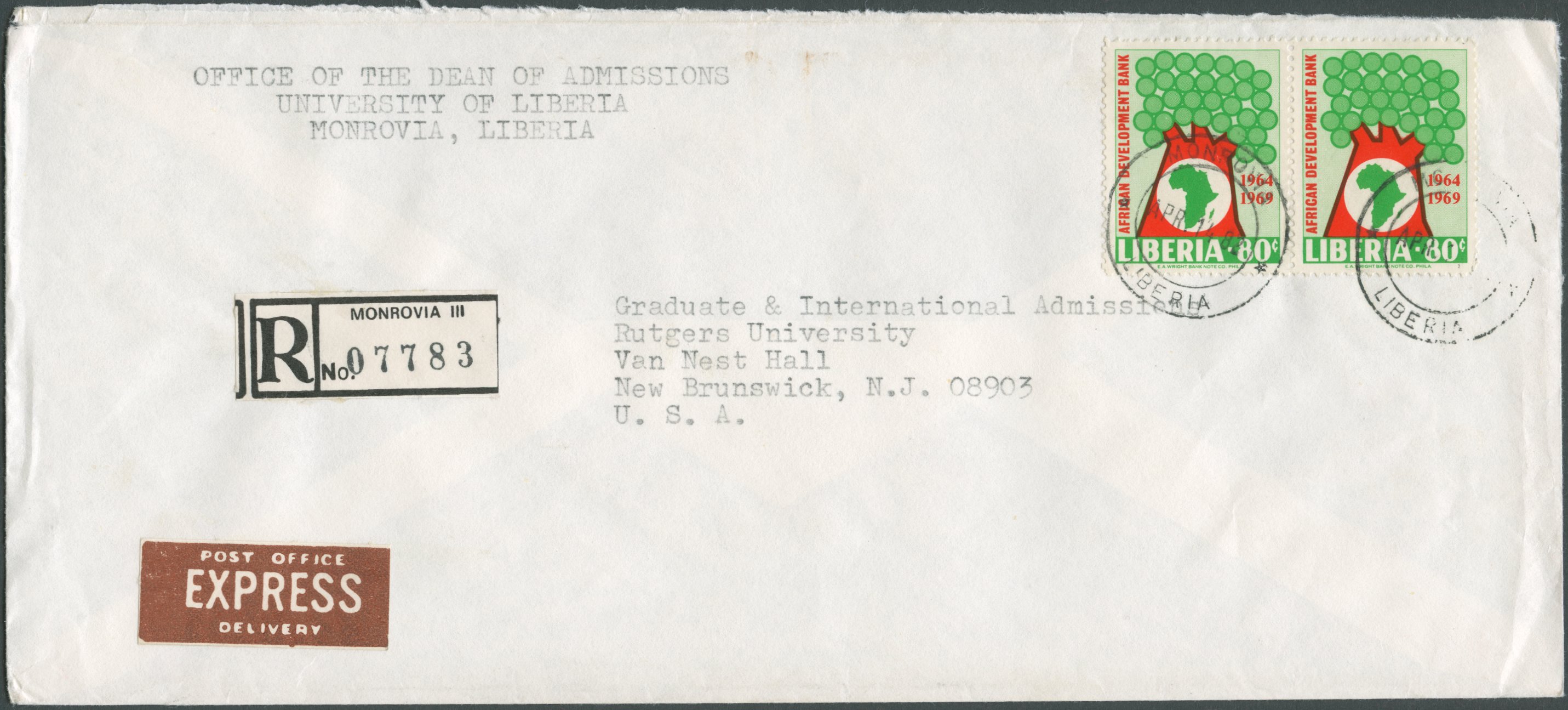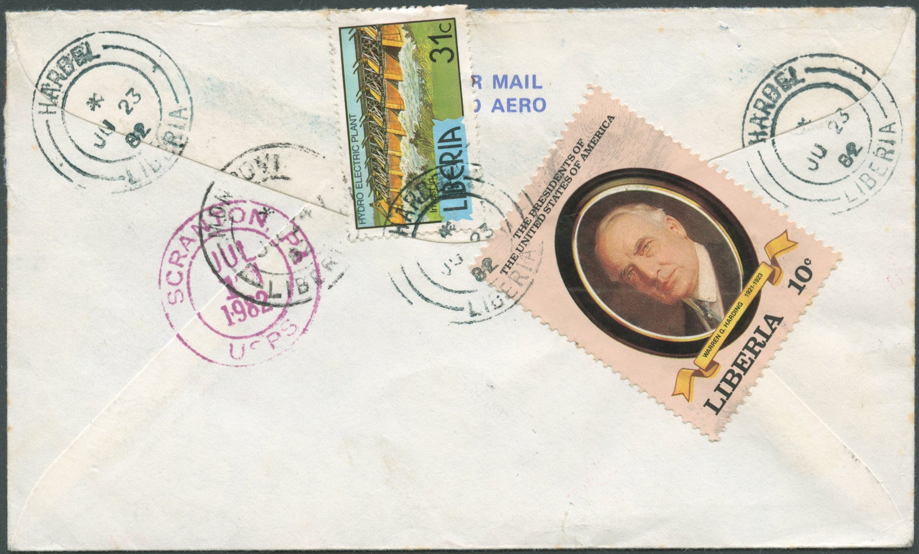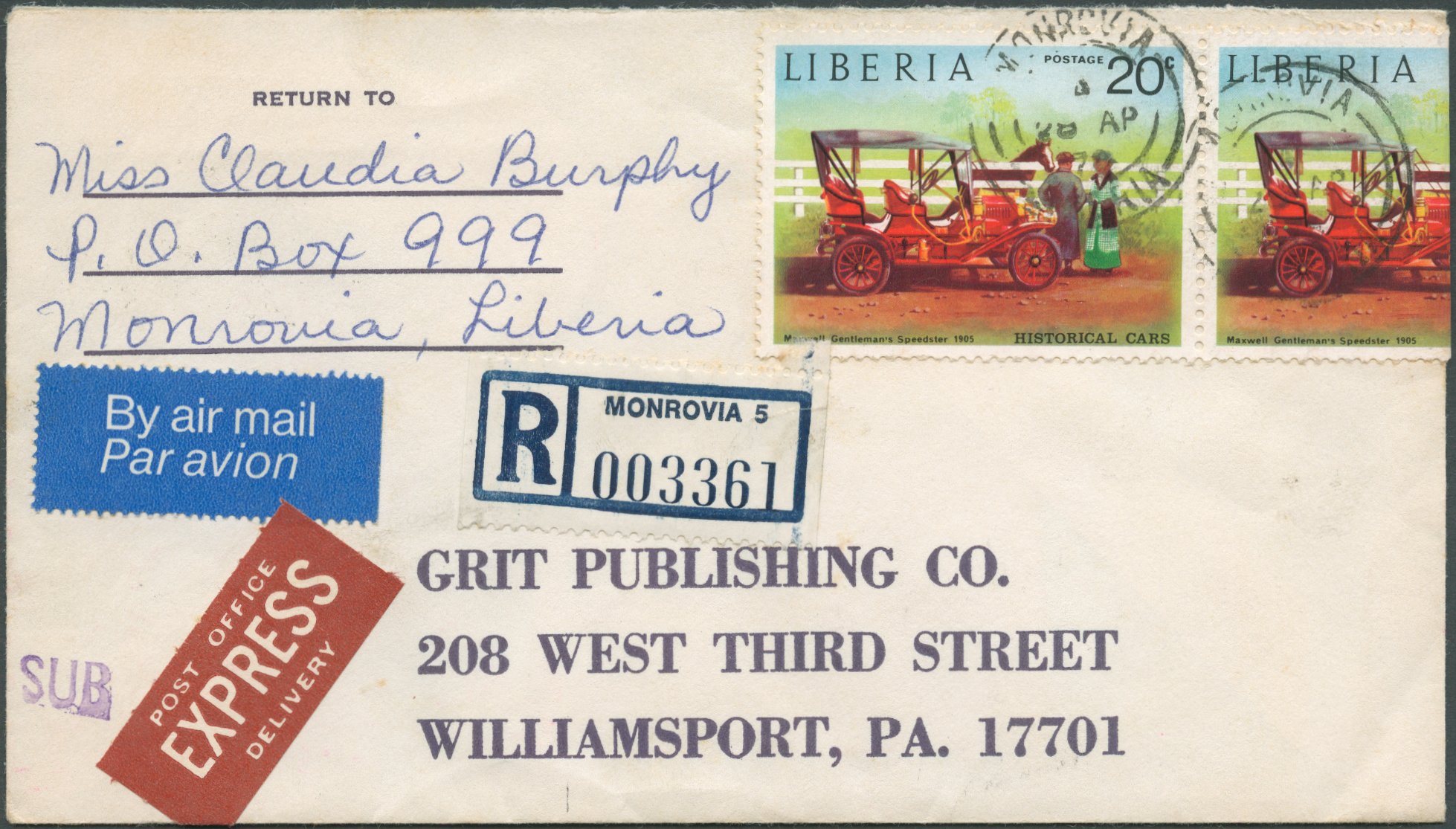 In 1860, Liberia issued her first postage stamps matching the rates of 6 cents per half-ounce or fraction thereof for local letters, 12 cents for distant towns and Sierra Leone and 24 cents for international mail. The next two decades saw numerous changes, with different rates applied to different foreign destinations, until Liberia joined the UPU in 1879. In the following, new stamps were issued in 1881/1882 for the rate of 3 cents per ½ oz. for inland mail and 8 cents for international mail. In 1892, the rate for foreign mail was lowered again to 5 cents per ½ oz. (5c and 10c stationery envelopes of 1893, triangle stamp of 1894). The 5 cent base rate essentially remained unchanged until 1968 [1], but sometime between 1923 [2, p.80] and 1928 [3] the single rate changed from half-ounce to ounce. Furthermore, in 1928 the 5 cent rate only applied to the first ounce, with heavier mail being charged at 3 cents per additional ounce [3] (see also [4] confirming the same rates for 1939).