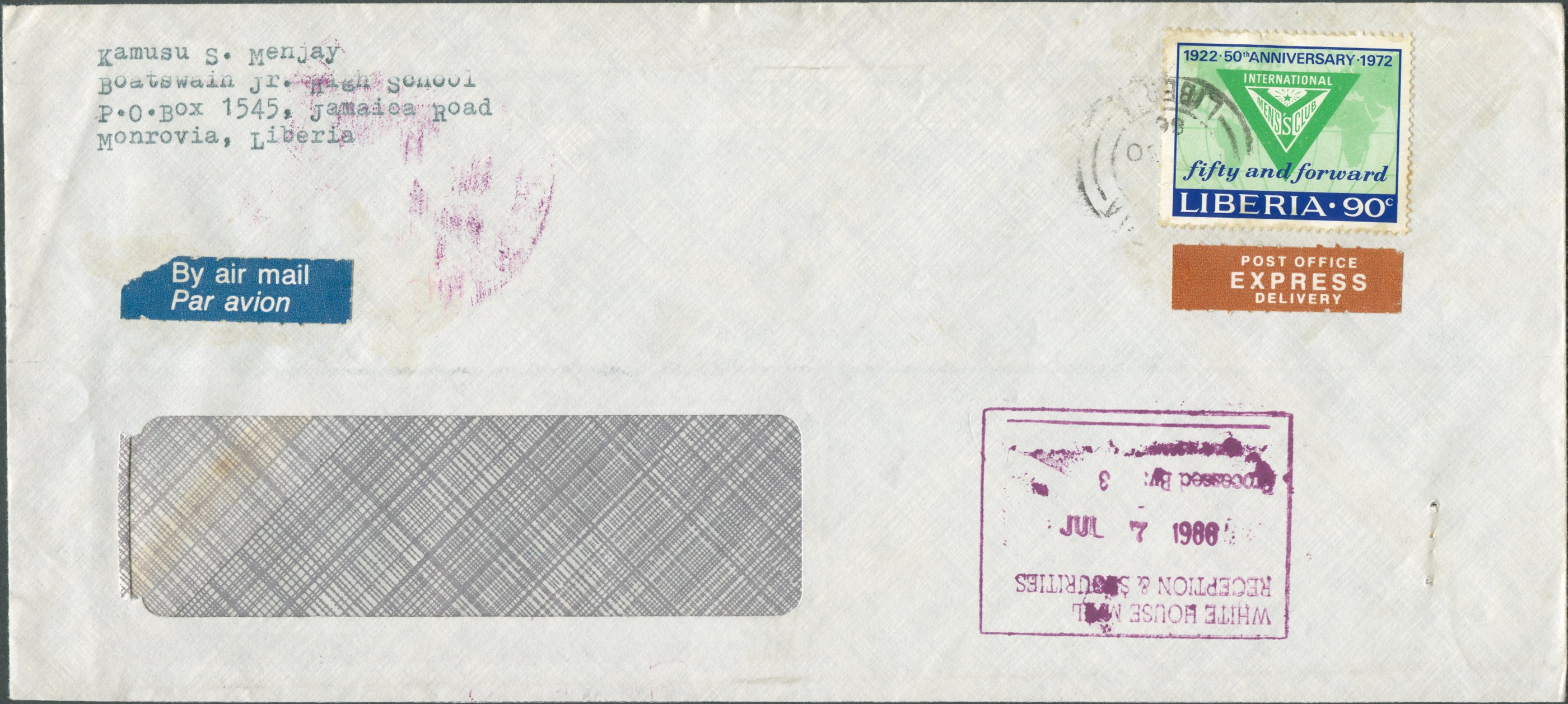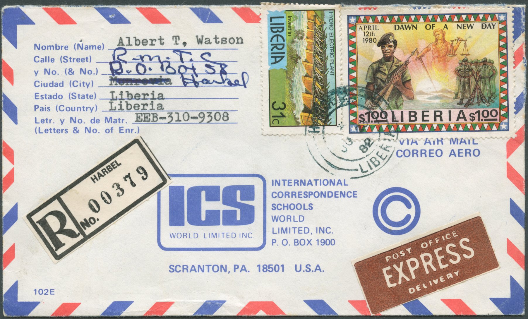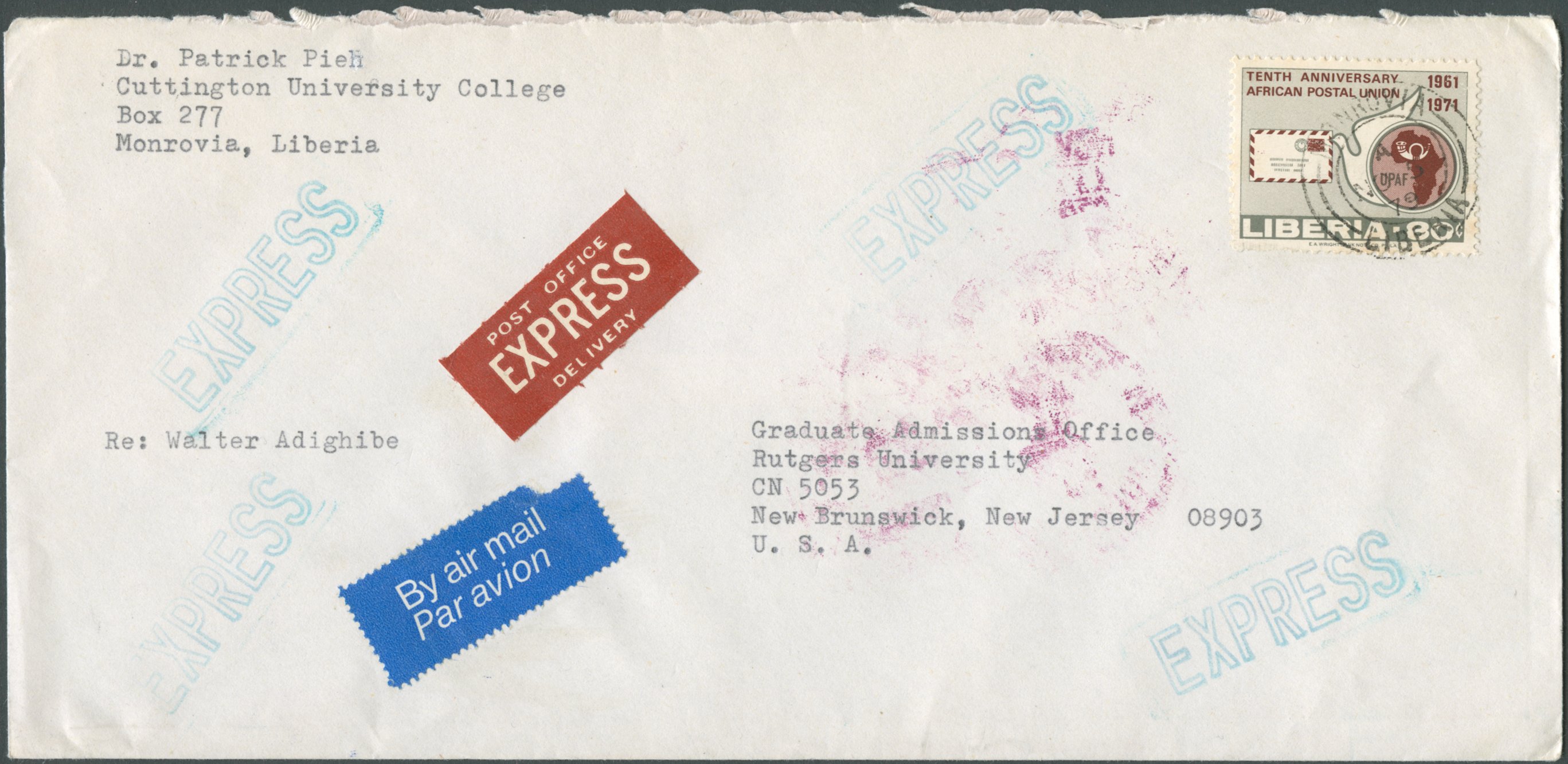 In 1860, Liberia issued her first postage stamps matching the rates of 6 cents per half-ounce or fraction thereof for local letters, 12 cents for distant towns and Sierra Leone and 24 cents for international mail. The next two decades saw numerous changes, with different rates applied to different foreign destinations, until Liberia joined the UPU in 1879. In the following, new stamps were issued in 1881/1882 for the rate of 3 cents per ½ oz. for inland mail and 8 cents for international mail. In 1892, the rate for foreign mail was lowered again to 5 cents per ½ oz. (5c and 10c stationery envelopes of 1893, triangle stamp of 1894). The 5 cent base rate essentially remained unchanged until 1968 [1], but sometime between 1923 [2, p.80] and 1928 [3] the single rate changed from half-ounce to ounce. Furthermore, in 1928 the 5 cent rate only applied to the first ounce, with heavier mail being charged at 3 cents per additional ounce [3] (see also [4] confirming the same rates for 1939).