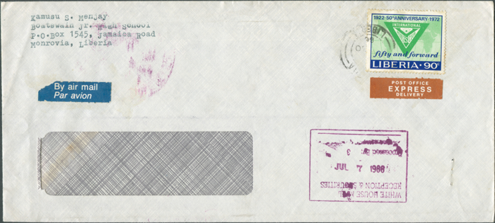 [4]Letters sent to or via Europe through the first regular international airmail services beginning in 1937 were charged at 21 cents for the first quarter-ounce, plus 15 cents per additional quarter-ounce. The first rate changed to 25 cents sometime between June 17 and 21 1939 and remained constant until June/July 1940, when all air service was suspended due to WW II; however, the total franking found on some covers of that period - 43 cents at first and 46 cents later - suggests two different second rates, most likely reflecting another rate change in March 1940 (H. Chlanda, pers. comm.). A 50 cents per ½ oz. rate, obviously planned for 1941, was finally set into effect on February 14, 1942 (“First Flight Liberia–US 1941” 50c overprints, but no airmail seems to have left or reached Liberia during that year). The next change came on June 17, 1942 with a 90 cents per ½ oz. rate [7], reduced to 70 cents per ½ oz. about twelve months later. Stamps complementing the 1942 airmail set were issued in 1944 for the new rates including values covering a new inland airmail rate of 12 cents per ½ oz. [8, p.96]. On March 1, 1947, the rate for international airmail was reduced to 25 cents, which remained unchanged until the end of the 1970s.
