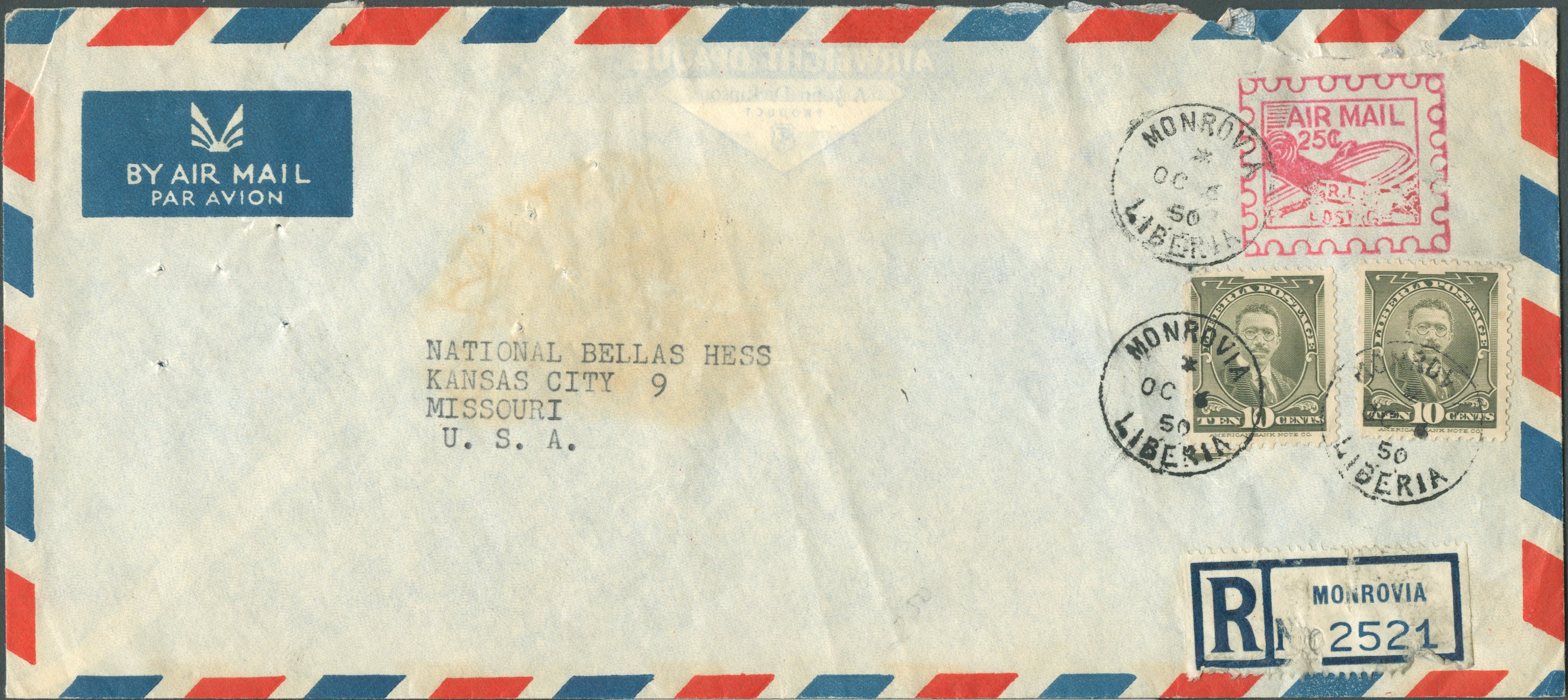 Registered airmail envelope sent on October 6, 1950 from Monrovia to National Bellas Hess, Kansas City, Missouri, USA; franking of 45 cents covering first rate (25 cents) + registration (20 cents)