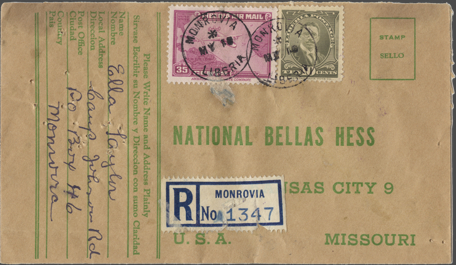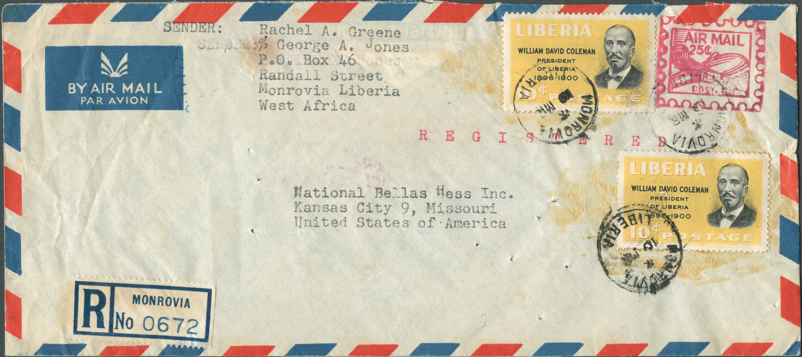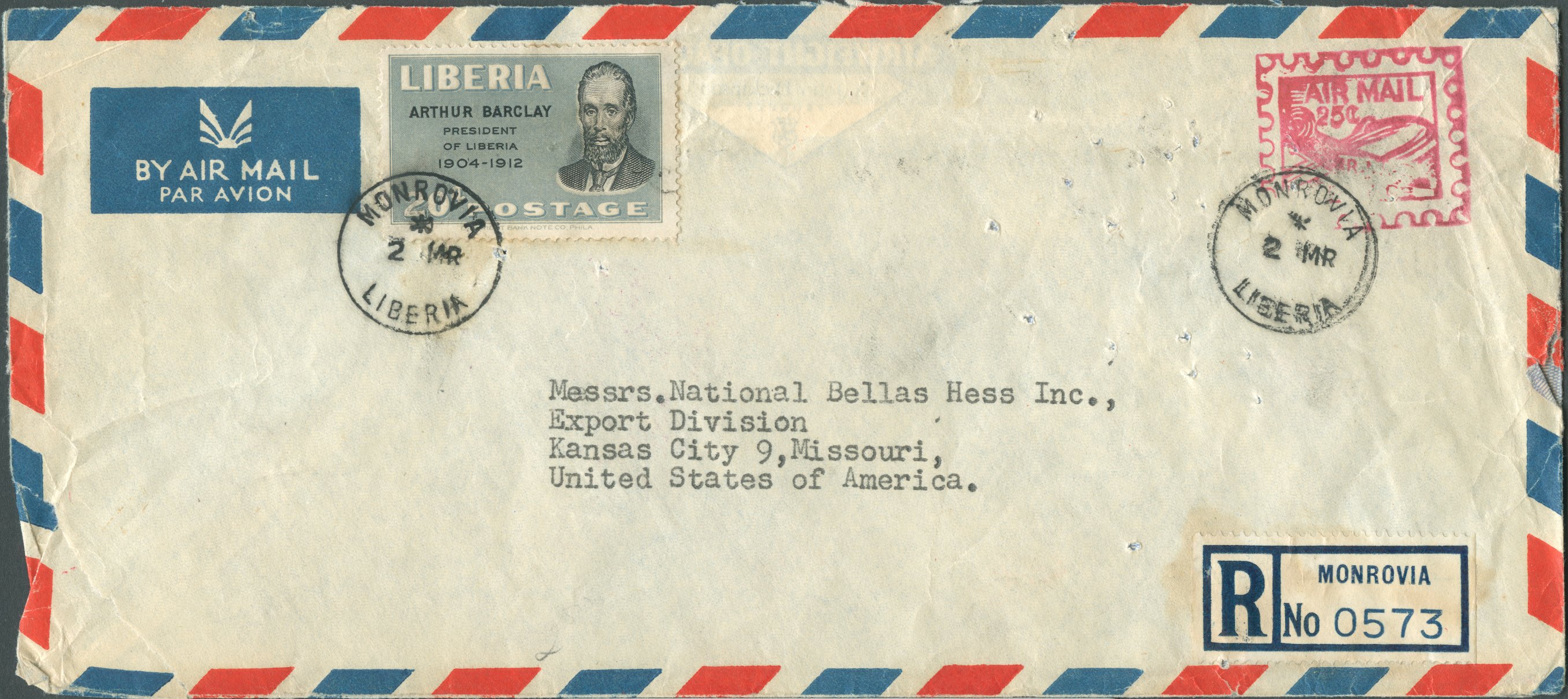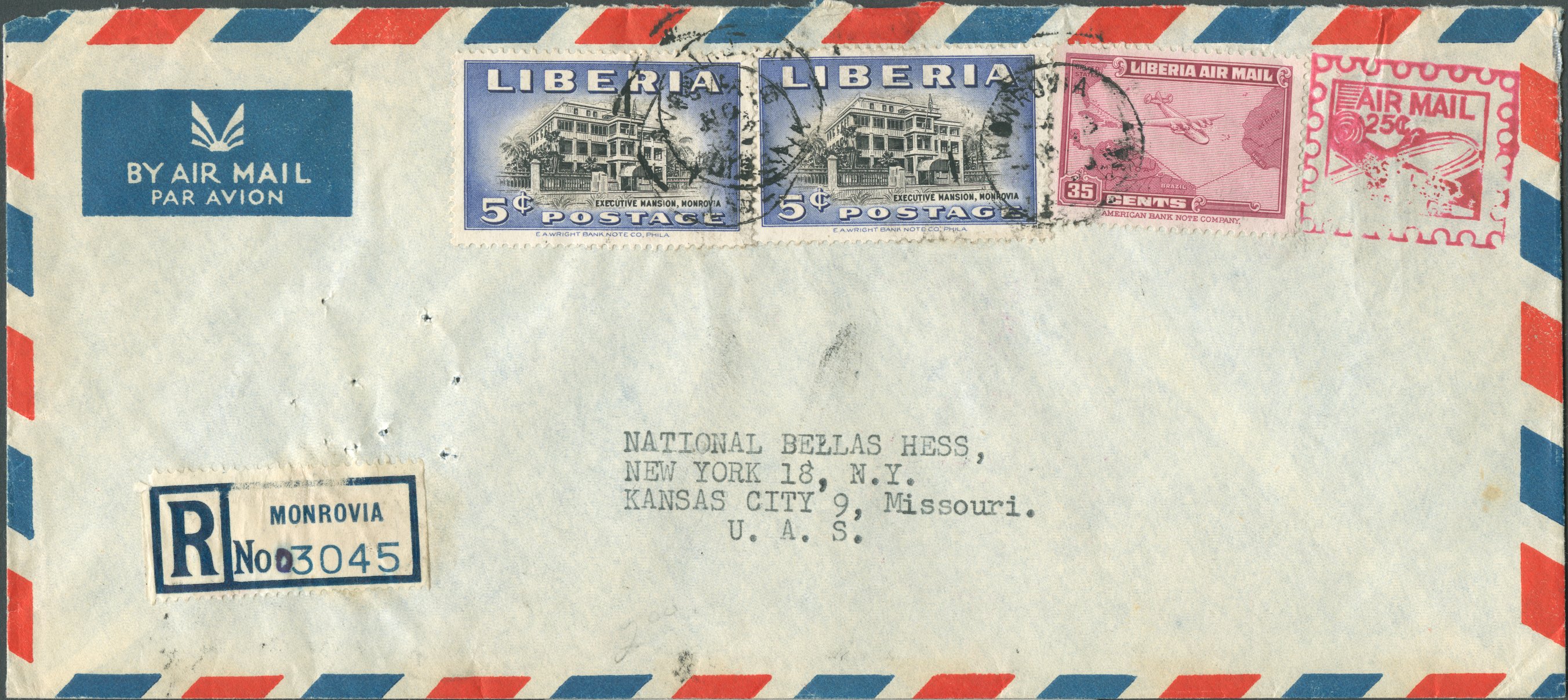 Registered airmail envelope sent on March 2, 1951 from Monrovia to National Bellas Hess, Kansas City, Missouri, USA; franking of 45 cents covering first rate (25 cents) + registration (20 cents)
