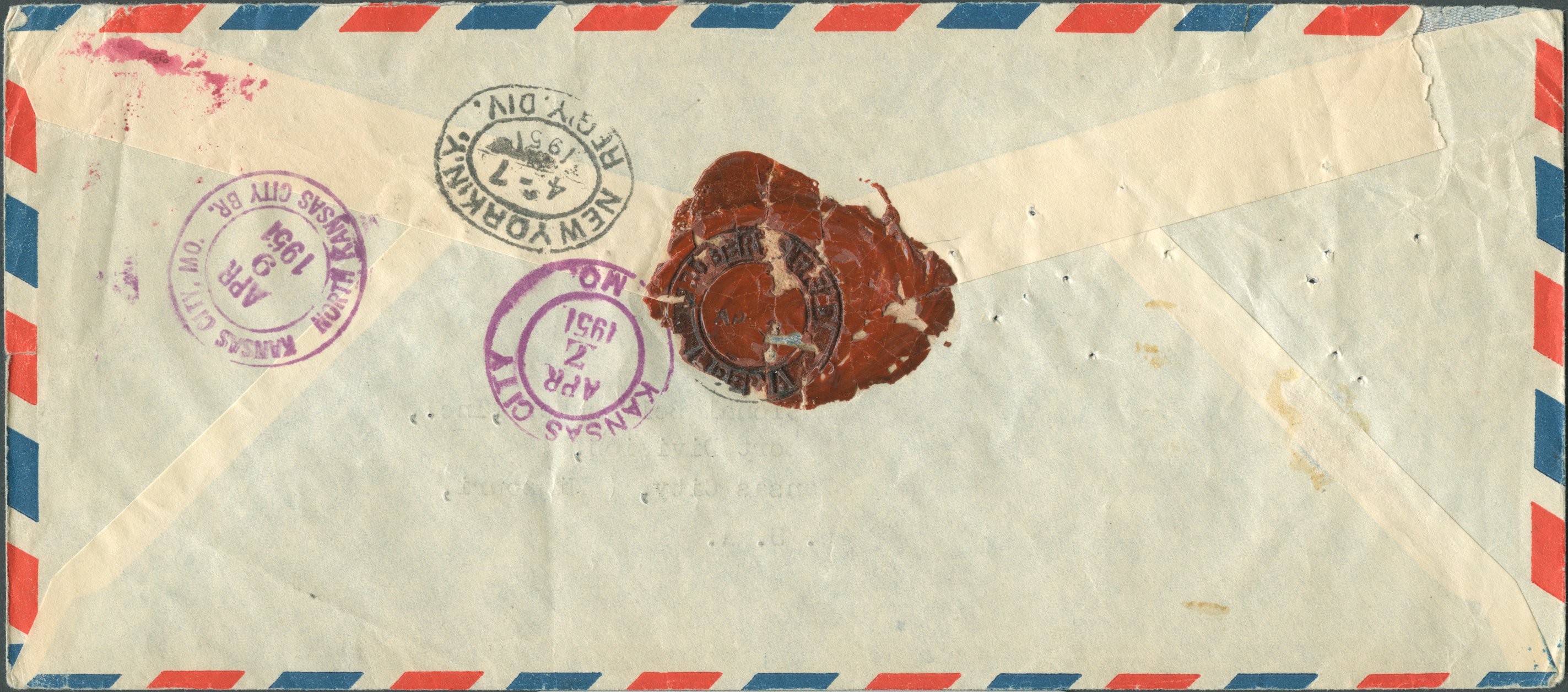 Registered airmail cover sent on May 10, 1951 from Monrovia to Kansas City, Missouri, USA; franking of 45 cents covering first rate (25 cents) + registration (20 cents)