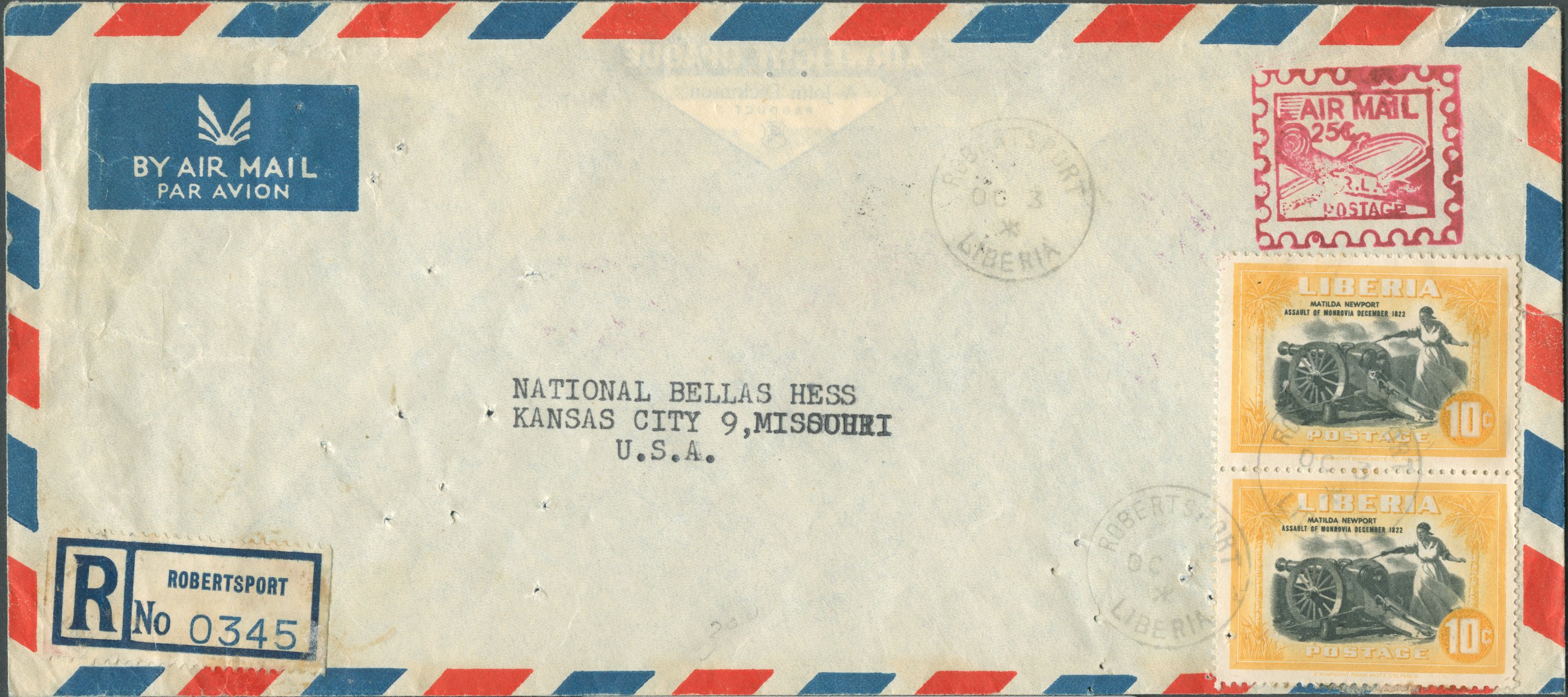 Registered airmail envelope sent on October 3, 1952 from Robertsport to National Bellas Hess, Kansas City, Missouri, USA; franking of 45 cents covering first rate (25 cents) + registration (20 cents)