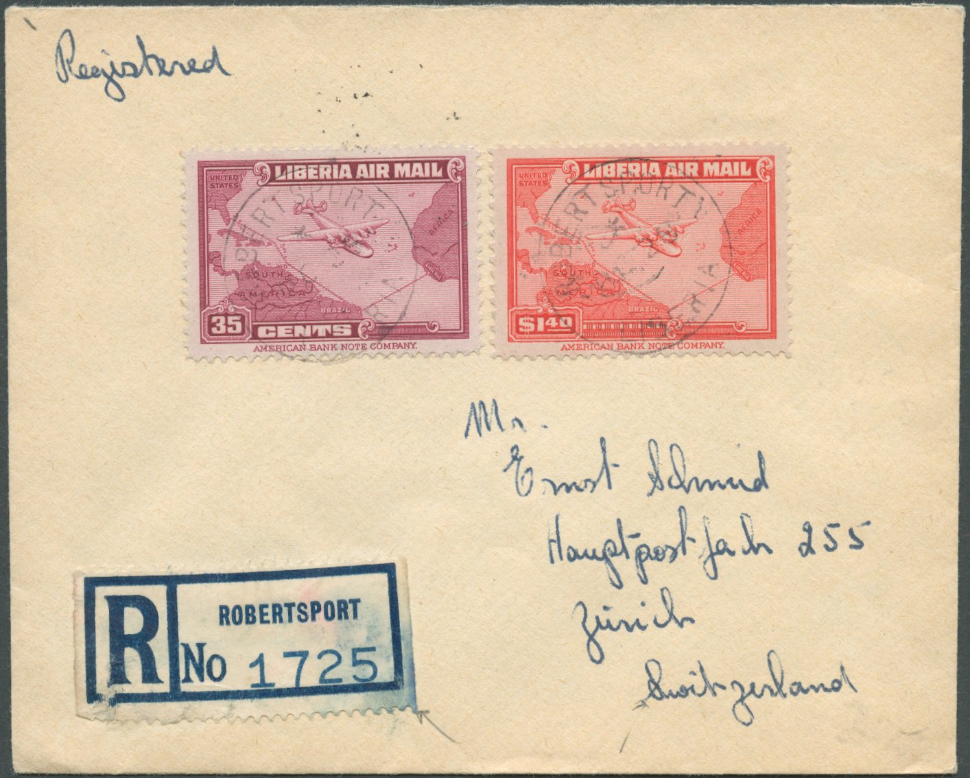 Registered airmail cover sent on October 26, 1955 from Robertsport to Zurich, Switzerland; franking of $1.75 covering up to sixth rate (6*25 cents) + registration (20 cents)