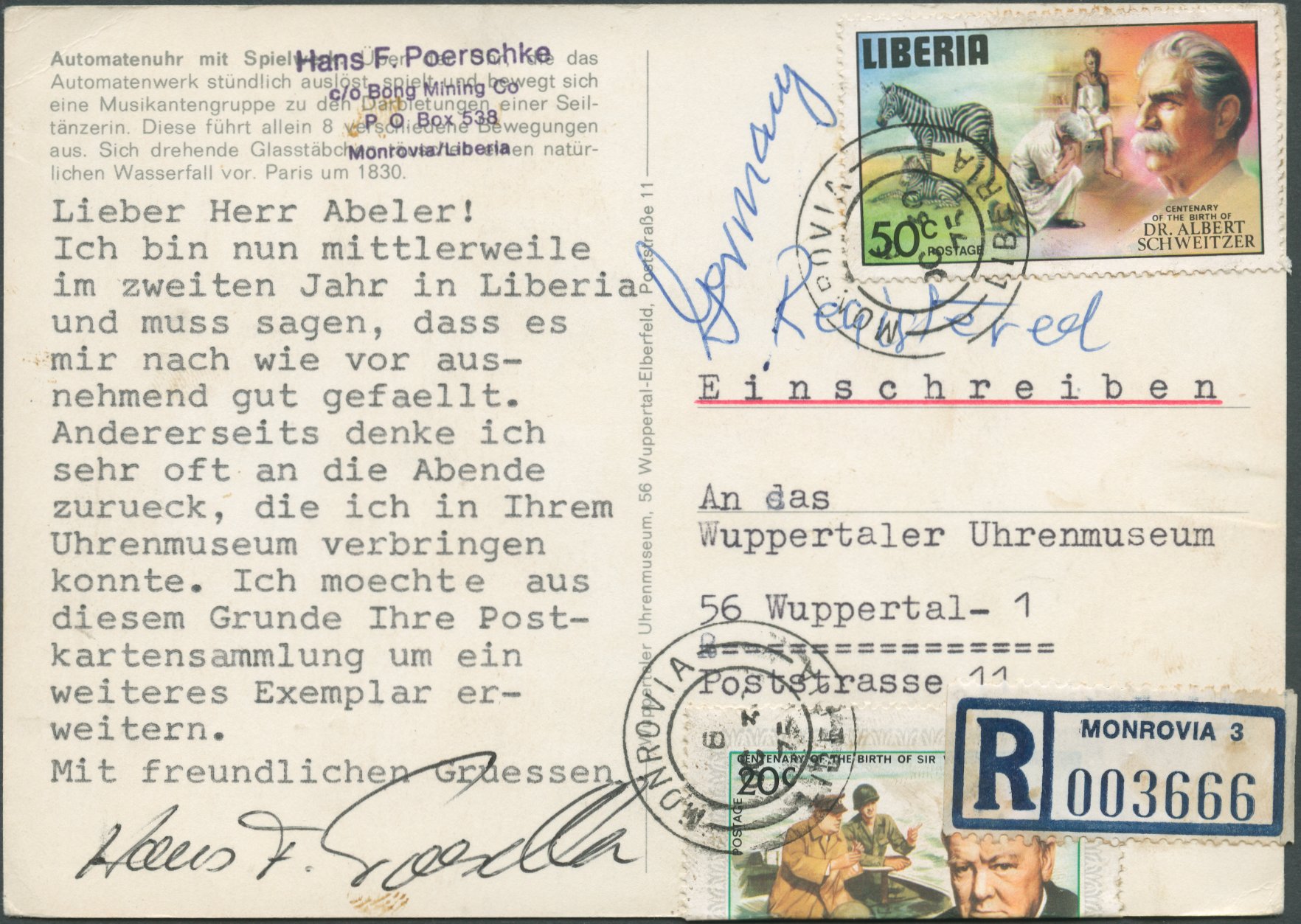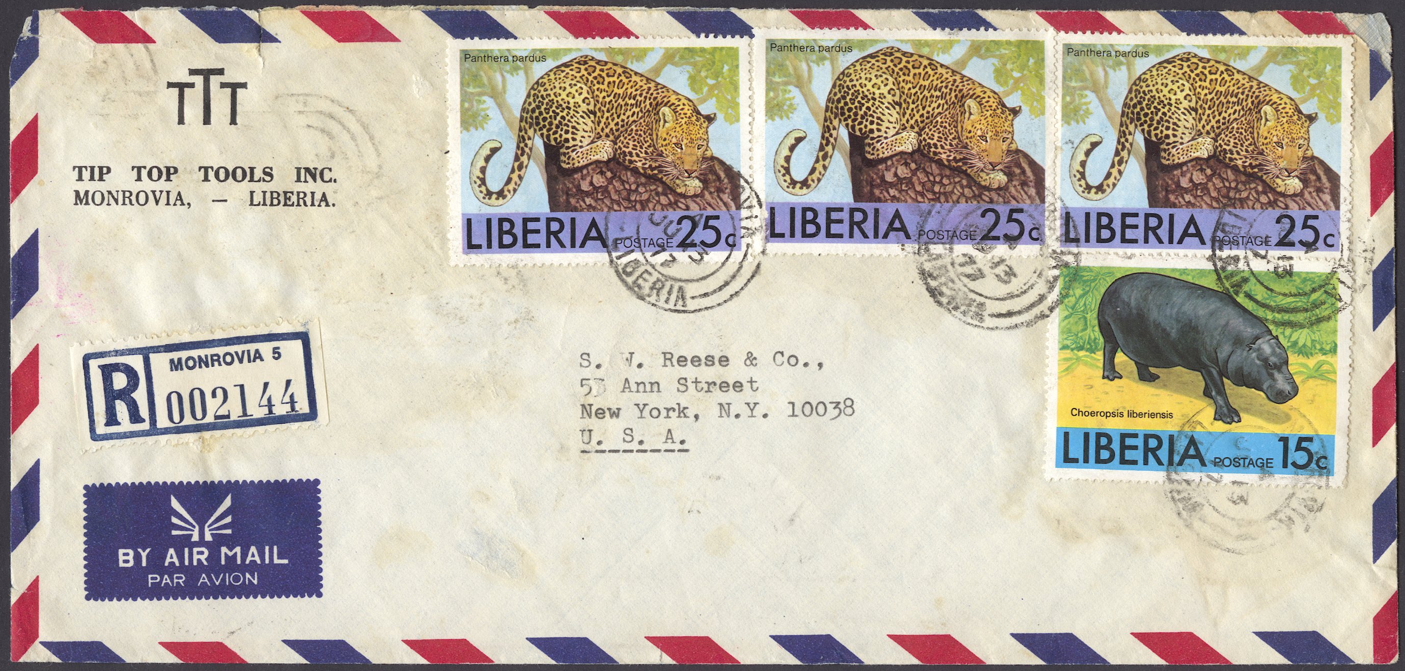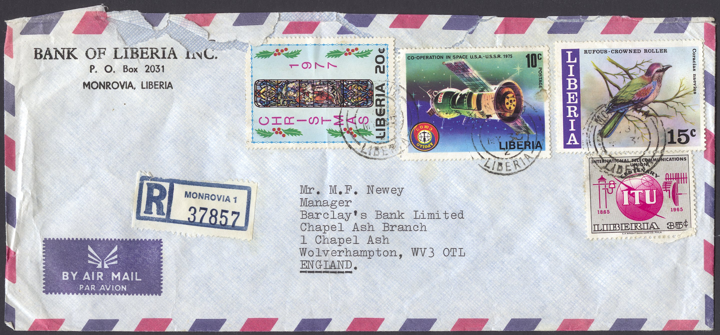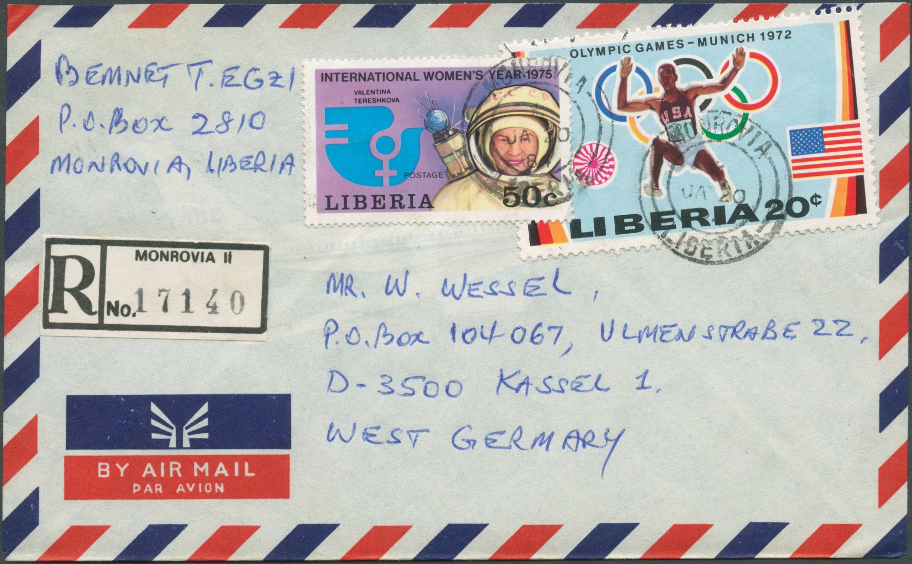 Registered airmail cover sent on October 30, 1975 from Monrovia to Wuppertal, Germany; franking of 70 cents covering postcard rate (15 cents) + registration (55 cents)