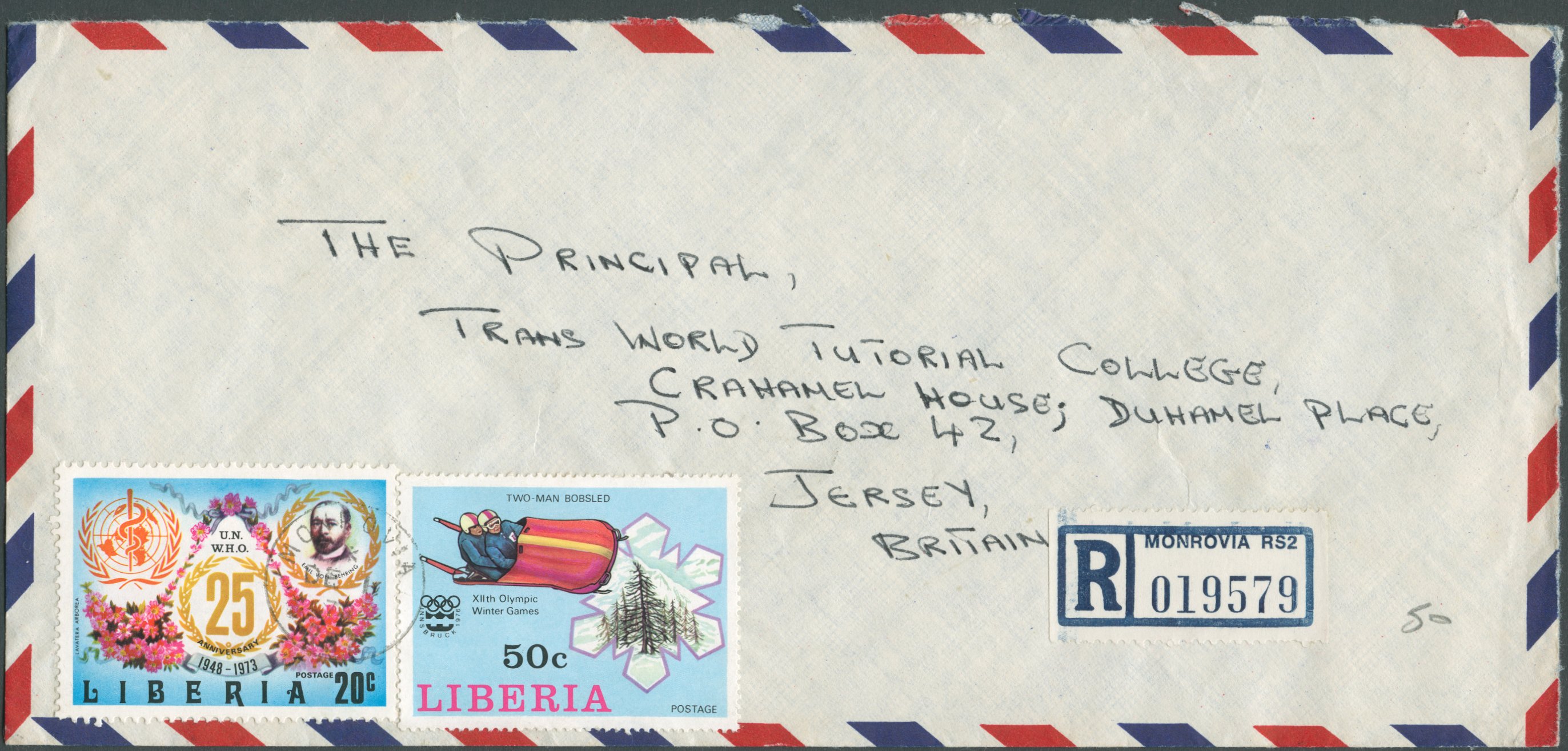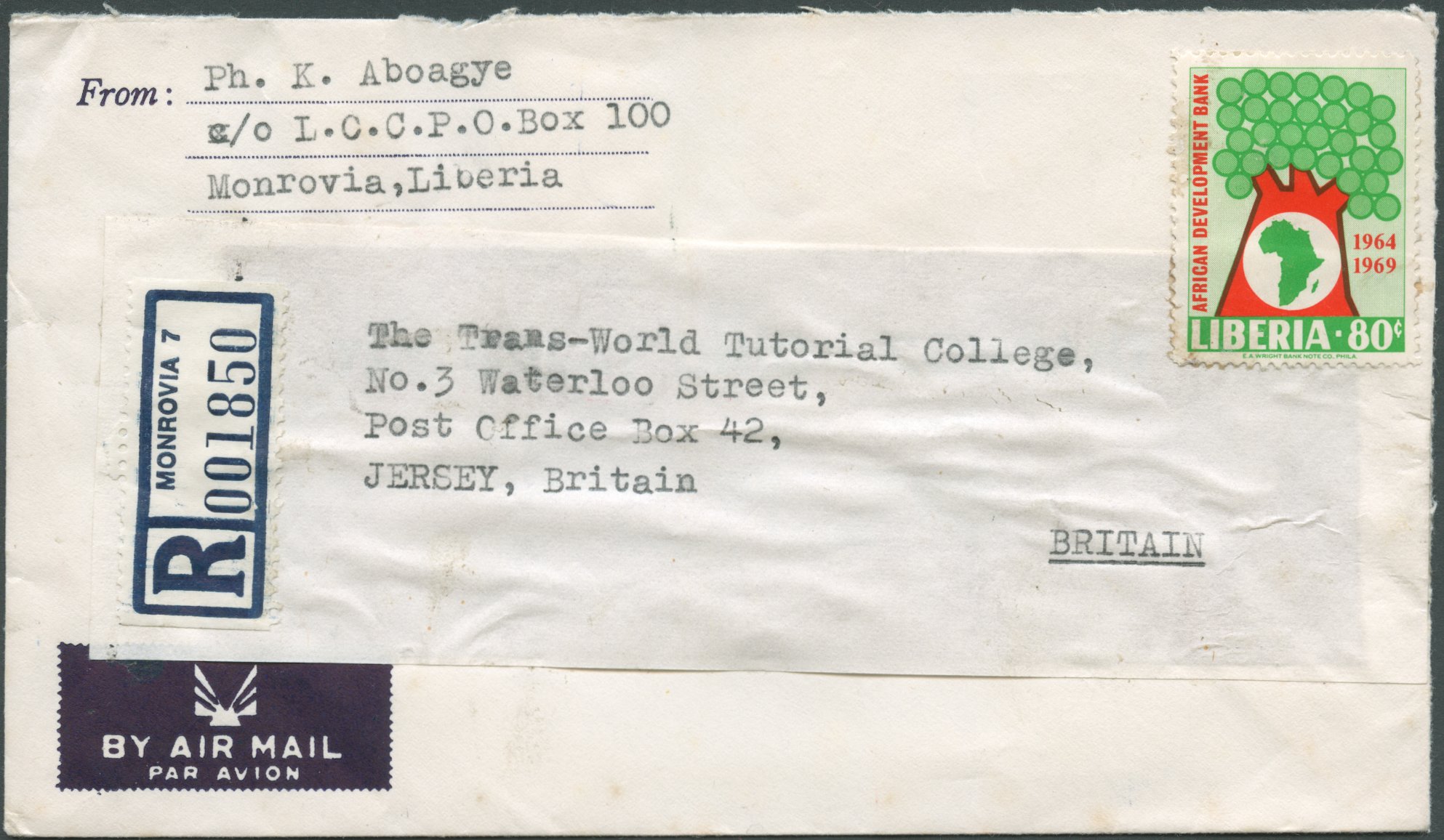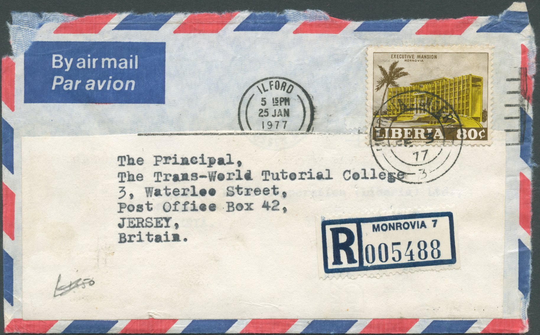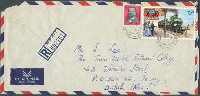Registered airmail cover sent in ca. 1977 from Monrovia to Jersey, British Isles; franking of 80 cents covering first rate (25 cents) + registration (55 cents)