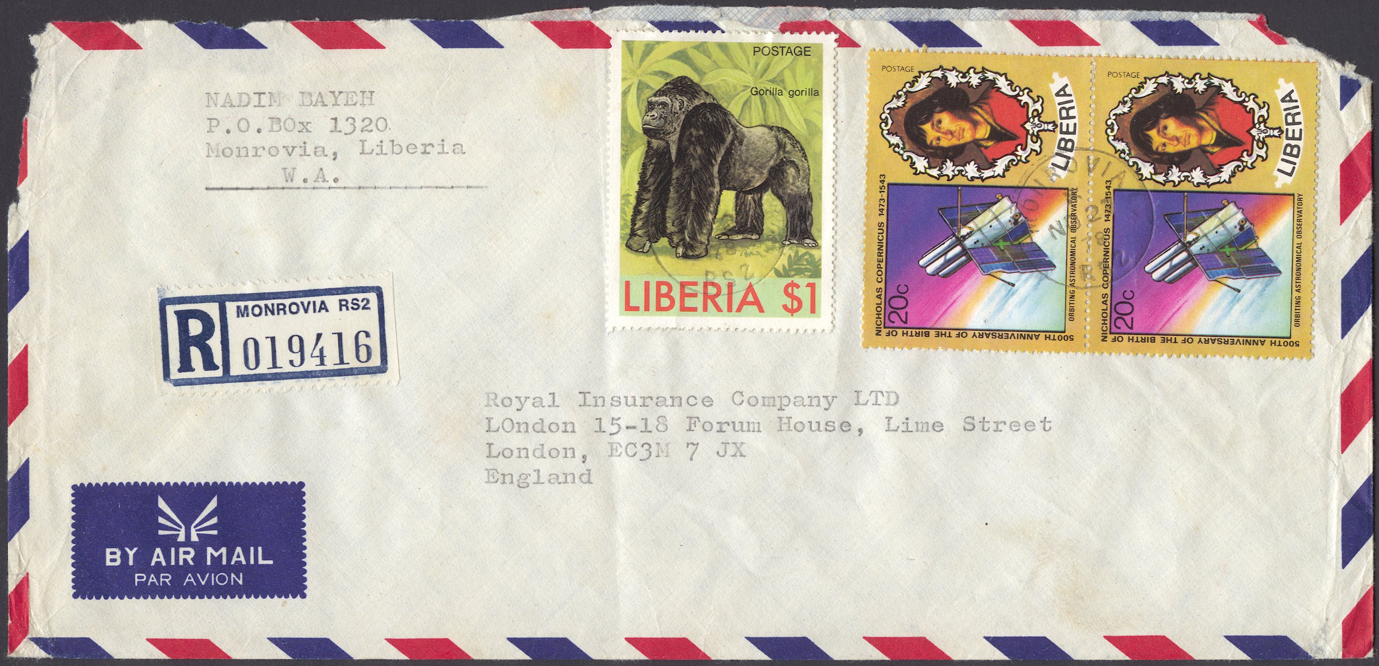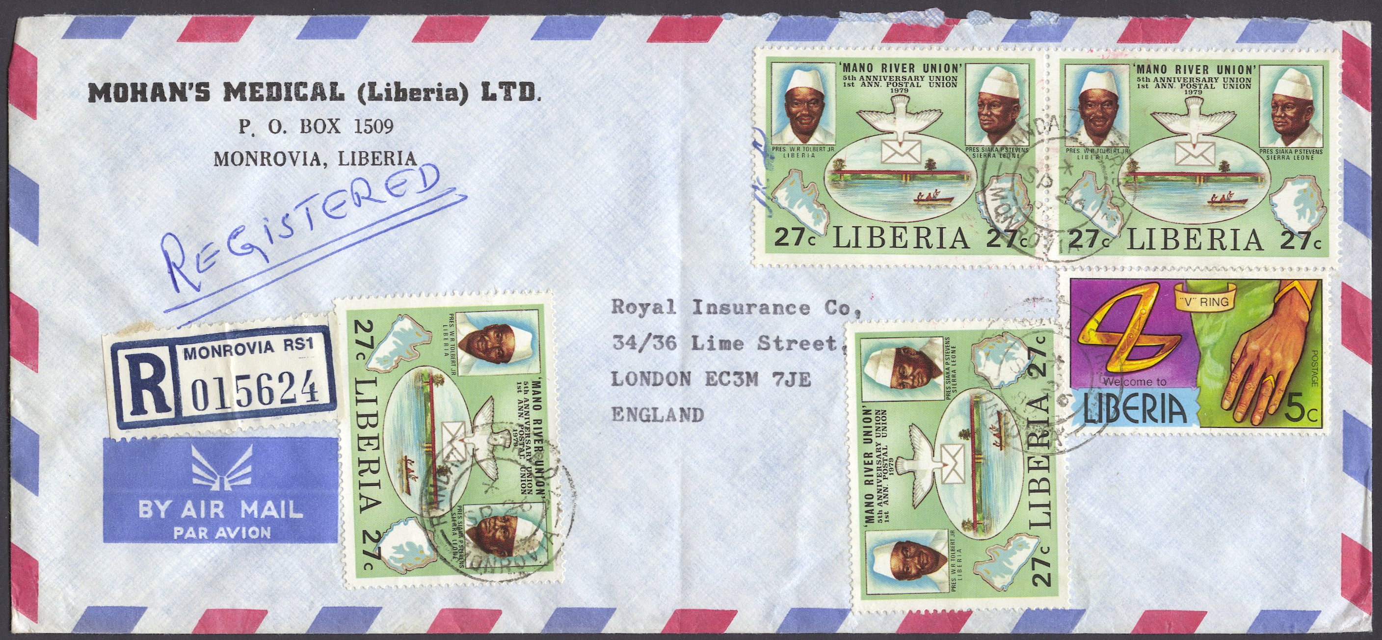 Registered airmail cover sent on September 26, 1980 from Monrovia to London, England; franking of $1.13