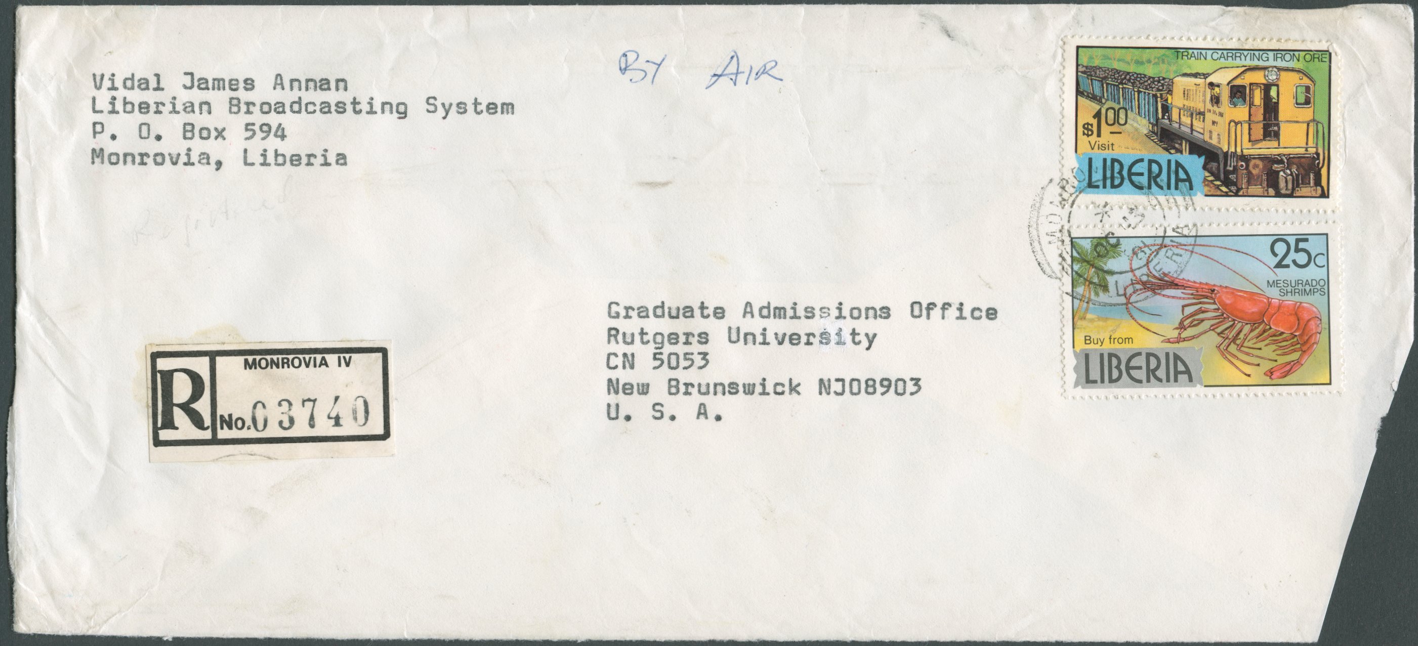 Registered airmail cover sent on November 6, 1981 from Monrovia to New Brunswick, New Jersey, USA; franking of 70 cents