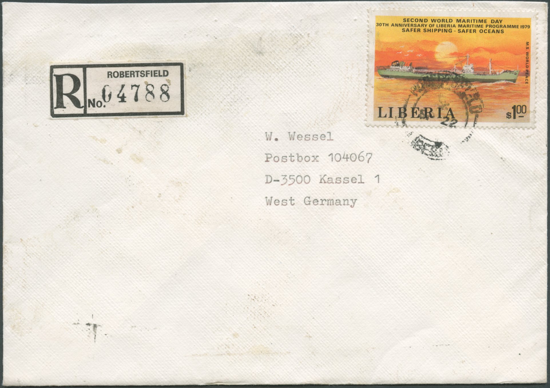Registered airmail cover sent on September 22, 1981 or later from Robertsfield to Kassel, West Germany; franking of $1.00