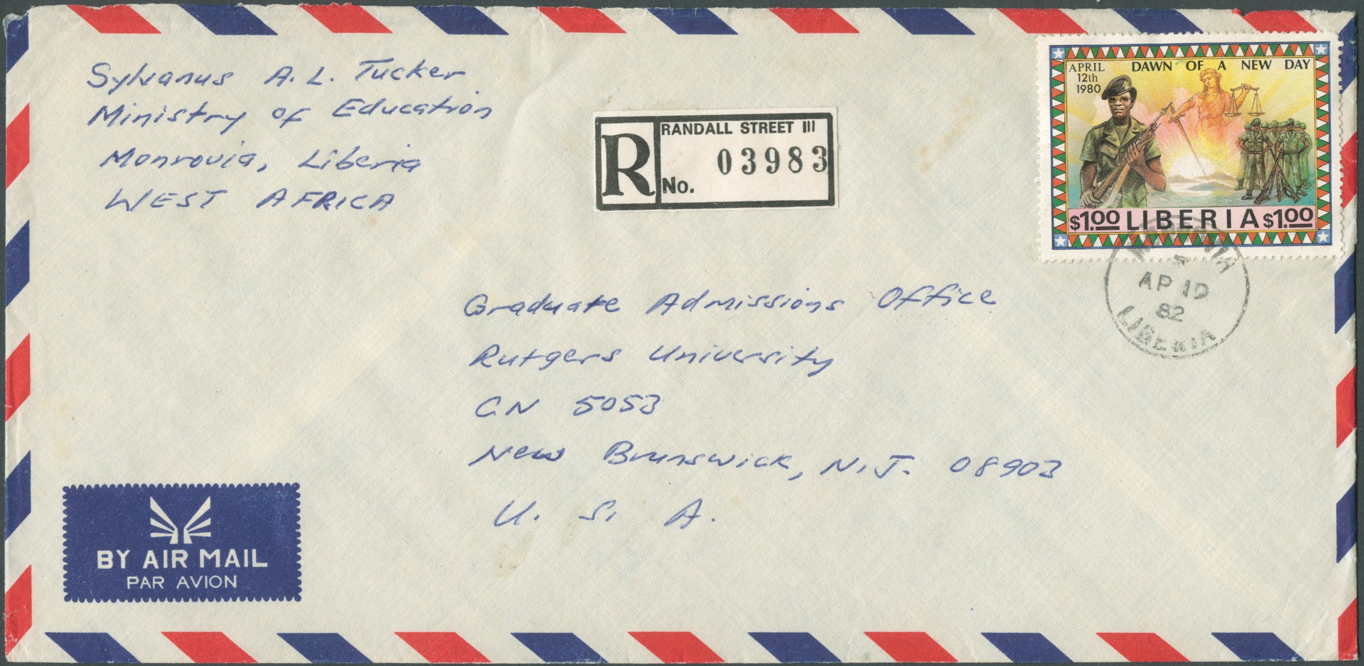 Registered airmail cover sent on April 19, 1982 from Monrovia to New Brunswick, New Jersey, USA; franking of $1.00