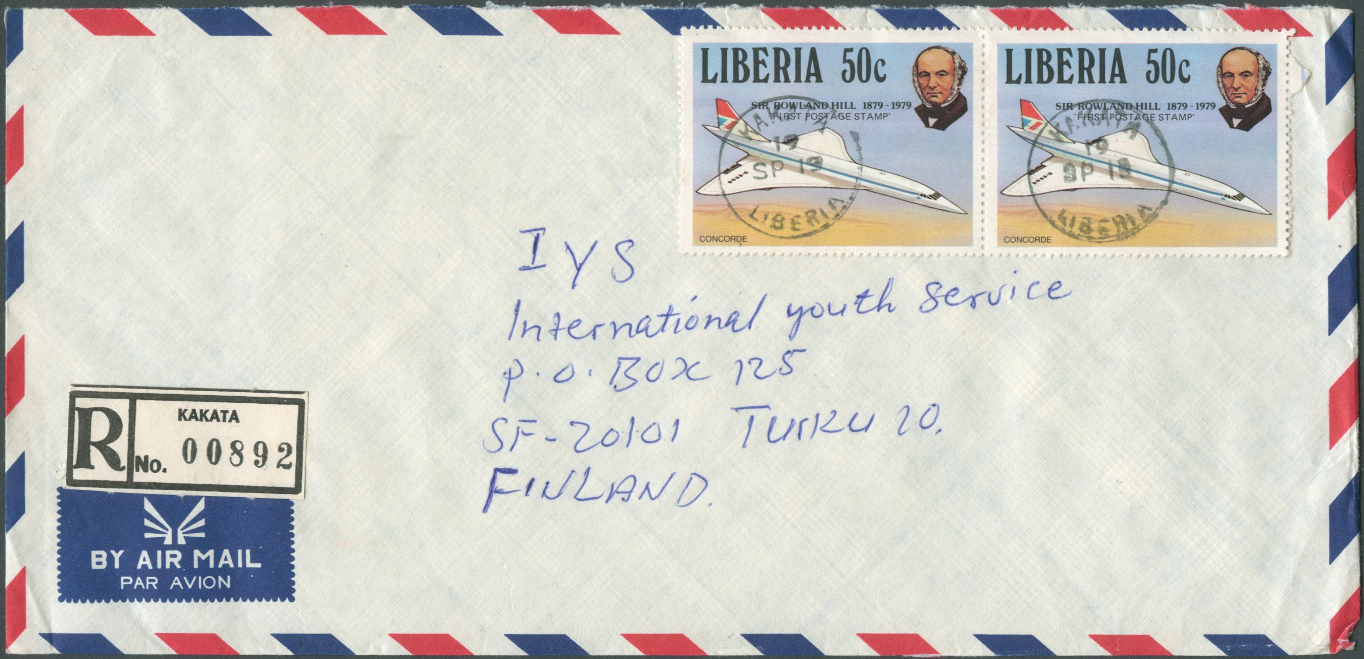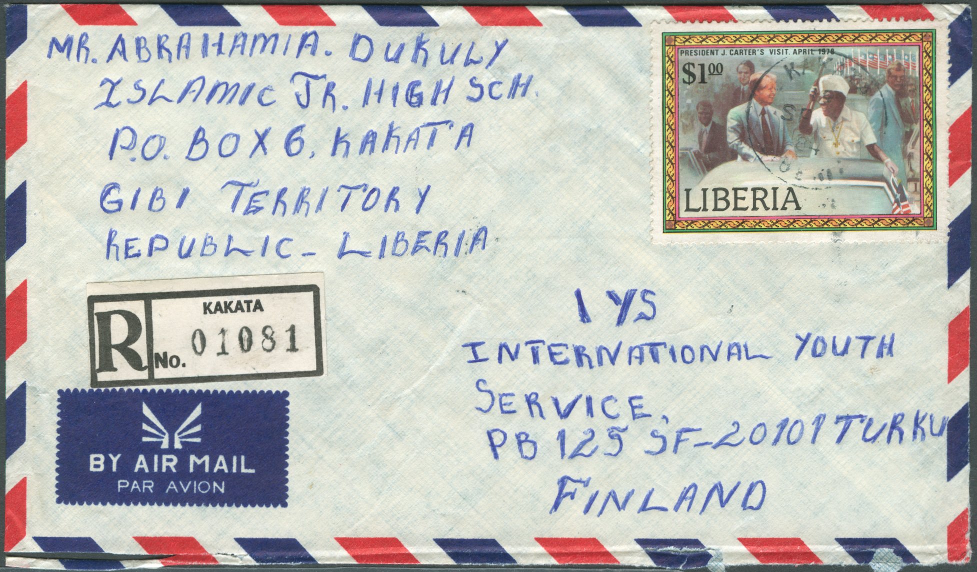 Registered airmail cover sent on September 19, 1983 from Kakata to Turku, Finland; franking of $1.00