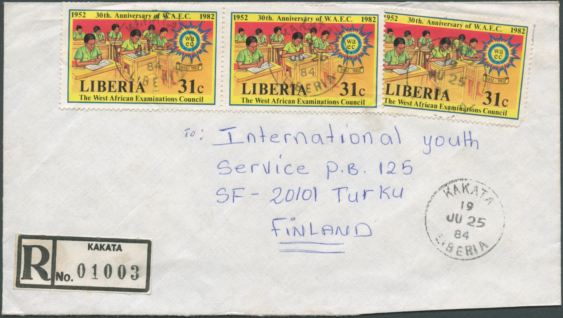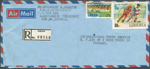 Registered airmail cover sent on June 25, 1984 from Kakata to Turku, Finland; franking of 93 cents