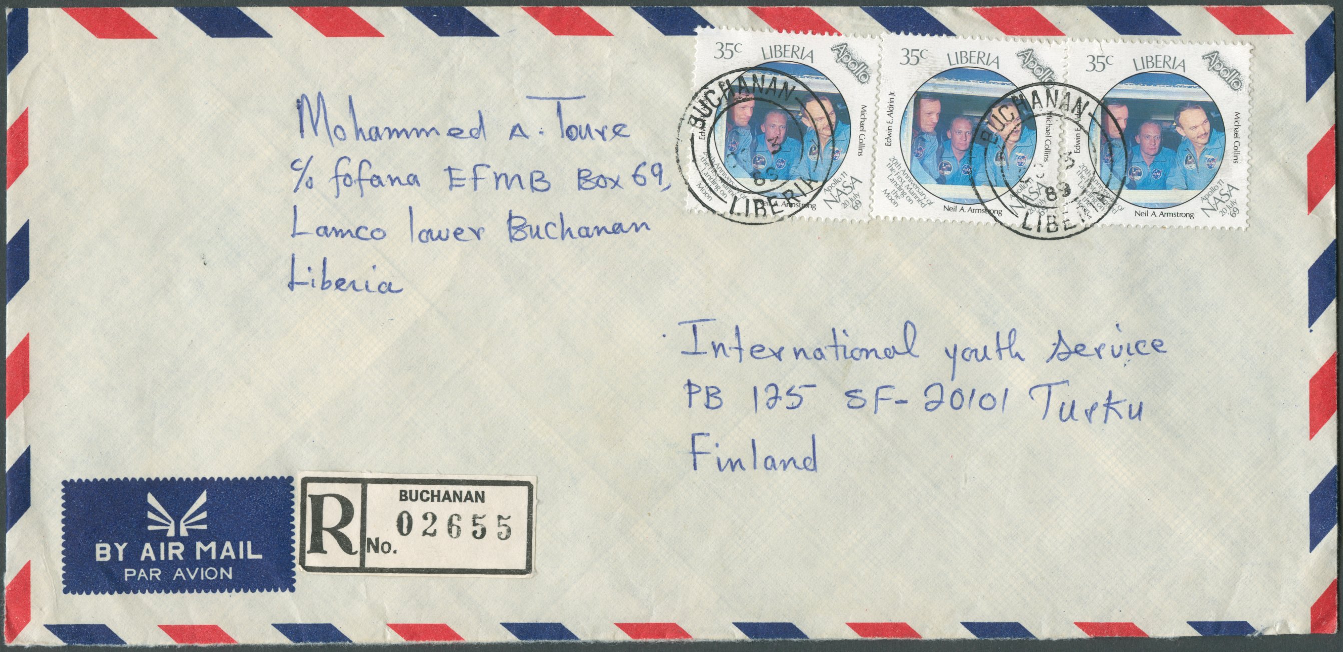 Registered airmail cover sent on May 4, 1984 from Monrovia to Turku, Finland; franking of $1.30