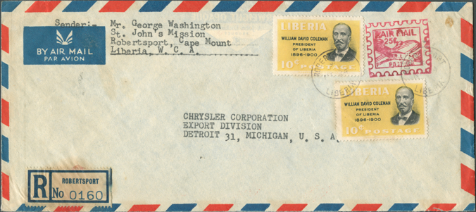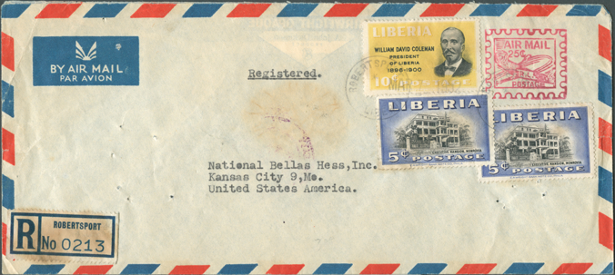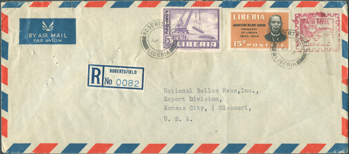 Registered airmail envelope sent on April 2, 1951 from Robertsfield to National Bellas Hess, Kansas City, Missouri, USA; franking of 45 cents covering first rate (25 cents) + registration (20 cents)