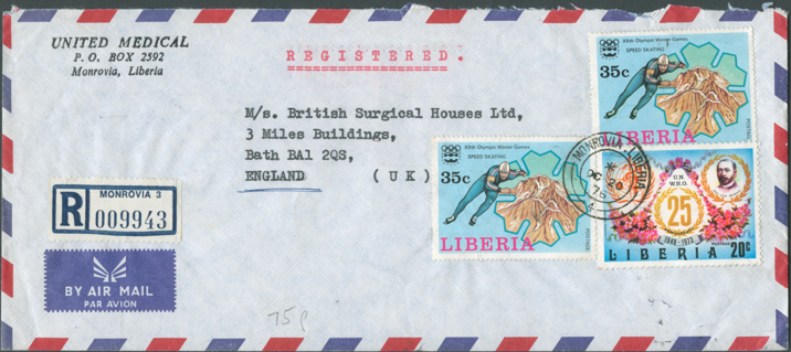 Registered airmail cover sent on October 20, 1976 from Monrovia to Bath, England; franking of 90 cents covering first rate (25 cents) + registration (55 cents)
