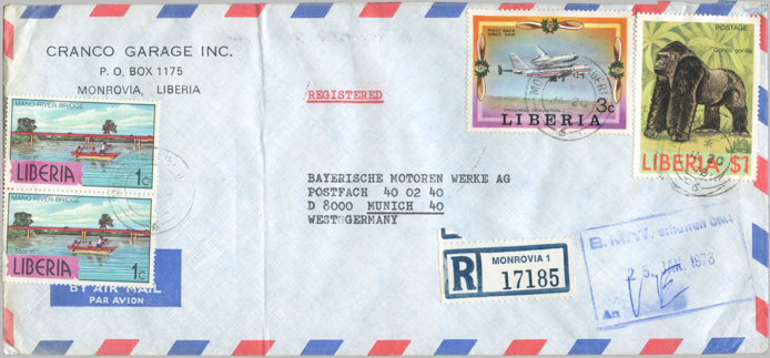 Registered airmail cover sent on January 20, 1978 from Monrovia to Munich, Germany; franking of $1.05 covering second rate (2*25 cents) + registration (55 cents)