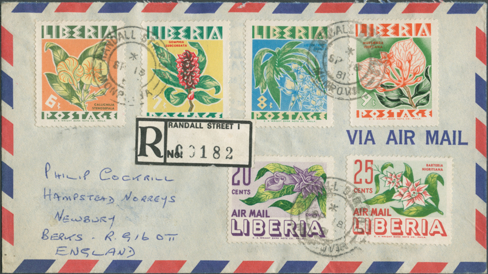 Registered airmail cover sent on September 18, 1981 from Monrovia to Philip Cockrill, Hampstead Norreys, Berkshire, England; franking of 75 cents