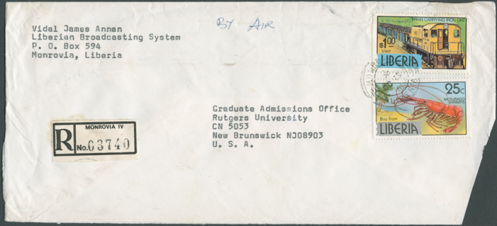 Registered airmail cover sent on October 13, 1981 from Monrovia to New Brunswick, New Jersey, USA; franking of $1.25