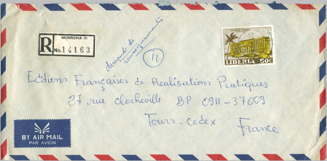 Registered airmail cover sent on October 6, 1982 from Monrovia to Tours, France; franking of 80 cents