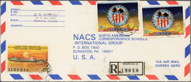Registered airmail cover sent on November 18, 1982 from Monrovia to Scranton, Pennsylvania, USA; franking of $1.50
