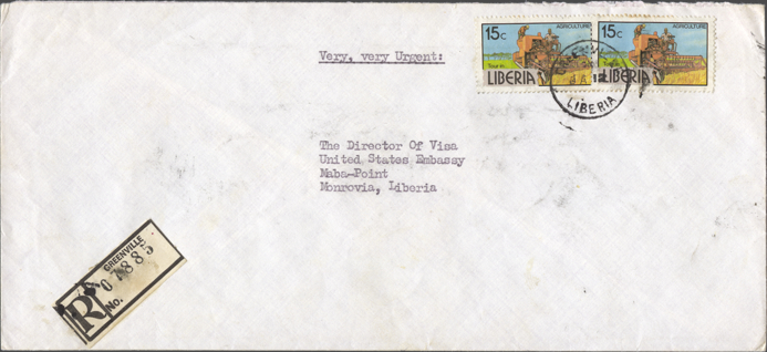 Registered airmail cover sent on January 12, 1987 from Greenville to Monrovia; franking of 30 cents