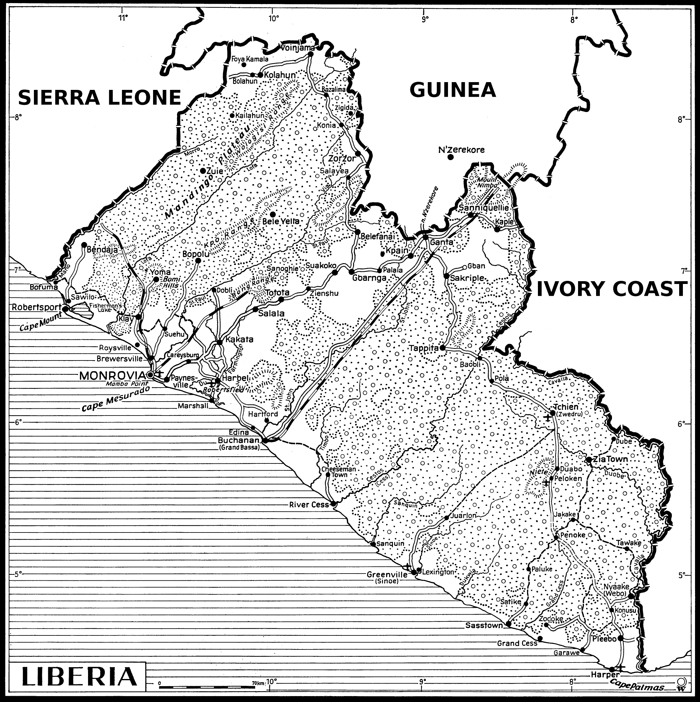 Liberia, situated in West Africa and bordered by Sierra Leone, Guinea, Ivory Coast and the Atlantic Ocean, is Africa’s oldest republic, and besides Ethiopia the only state on this continent with an uninterrupted history of independence. Initiated by the philanthropic “American Colonization Society” around 1820 as a settlement project for freed American slaves, it was officially proclaimed as Republic of Liberia on July 26, 1847.