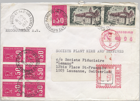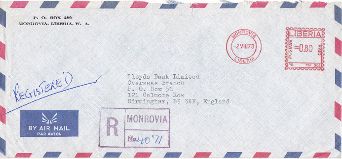 only showing the value but no words. The third meter type is another Pitney Bowes model, GB "5000", and has the seal of Liberia between the town mark and the indicium.