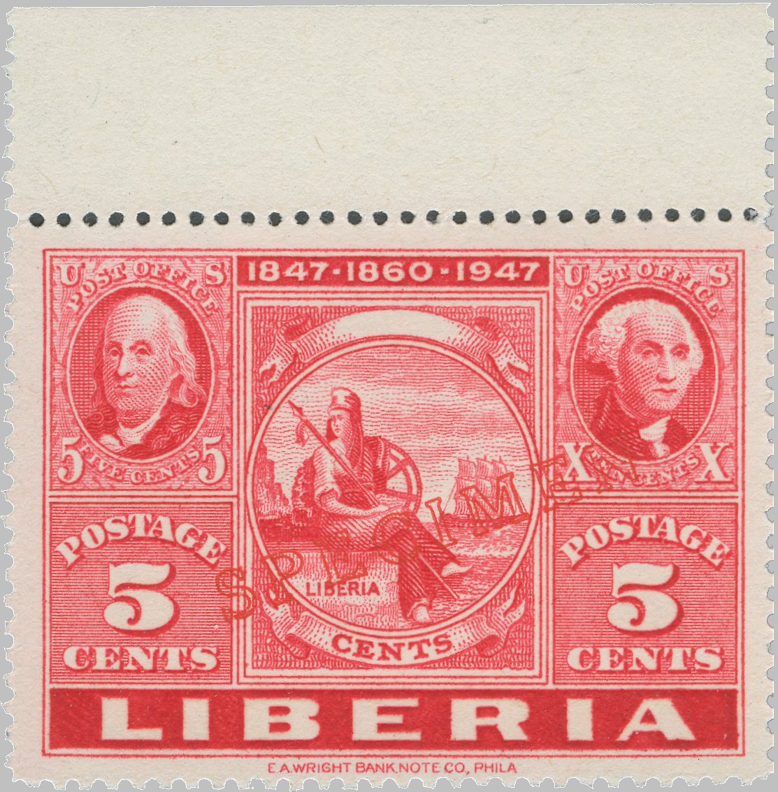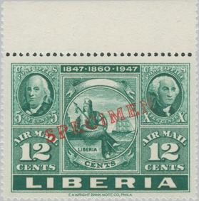 This page contains a loose collection of essays, proofs and specimens of Liberian stamps issued through 1960. About the terminology: essays either show stamp designs that were never used or designs that were used but altered for the final stamp; proofs, whether taken from the whole plate or directly from the single die, always show the final design or parts of it – but often in a different “trial” color and printed on different paper, e.g. cardboard – however, they can also have gum and be perforated like a normal stamp; specimens are the finished stamps as issued, but with overprint to indicate they are meant for distribution to postal authorities or sent as examples to the Universal Postal Union. From this it should be clear that the “Waterlow specimens” of the first pictorial issue printed in trial colors are really proofs.