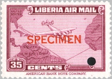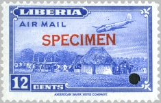 This page contains a loose collection of essays, proofs and specimens of Liberian stamps issued through 1960. About the terminology: essays either show stamp designs that were never used or designs that were used but altered for the final stamp; proofs, whether taken from the whole plate or directly from the single die, always show the final design or parts of it – but often in a different “trial” color and printed on different paper, e.g. cardboard – however, they can also have gum and be perforated like a normal stamp; specimens are the finished stamps as issued, but with overprint to indicate they are meant for distribution to postal authorities or sent as examples to the Universal Postal Union. From this it should be clear that the “Waterlow specimens” of the first pictorial issue printed in trial colors are really proofs.