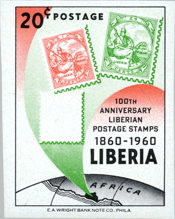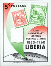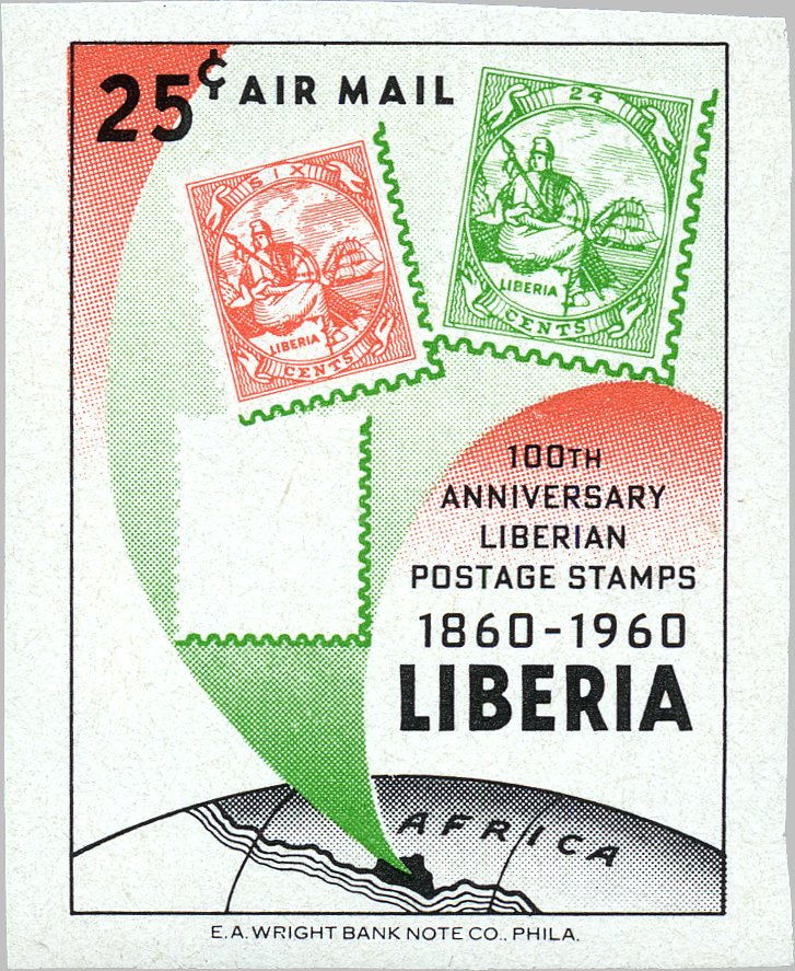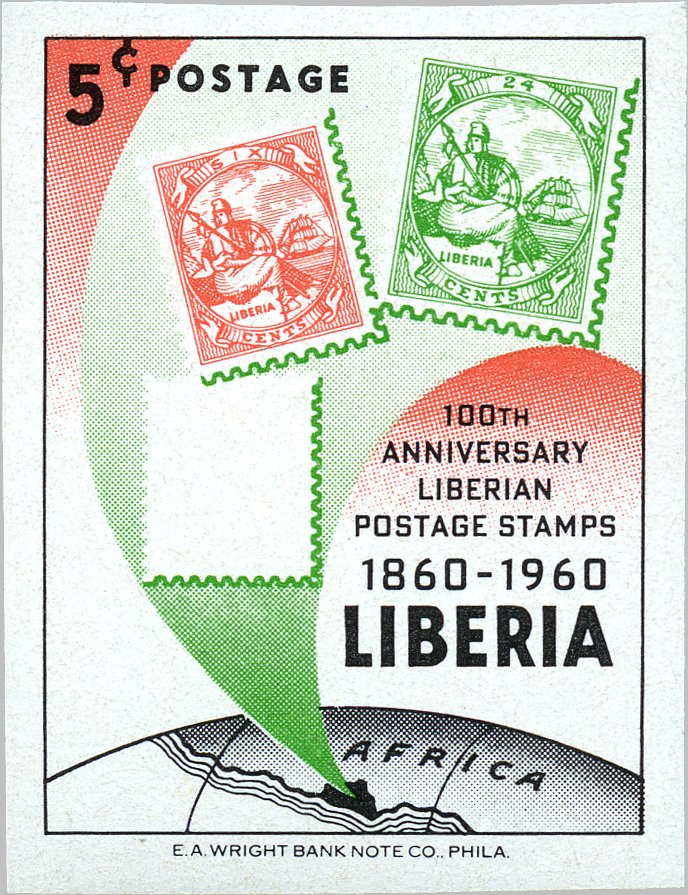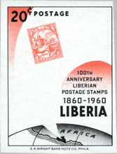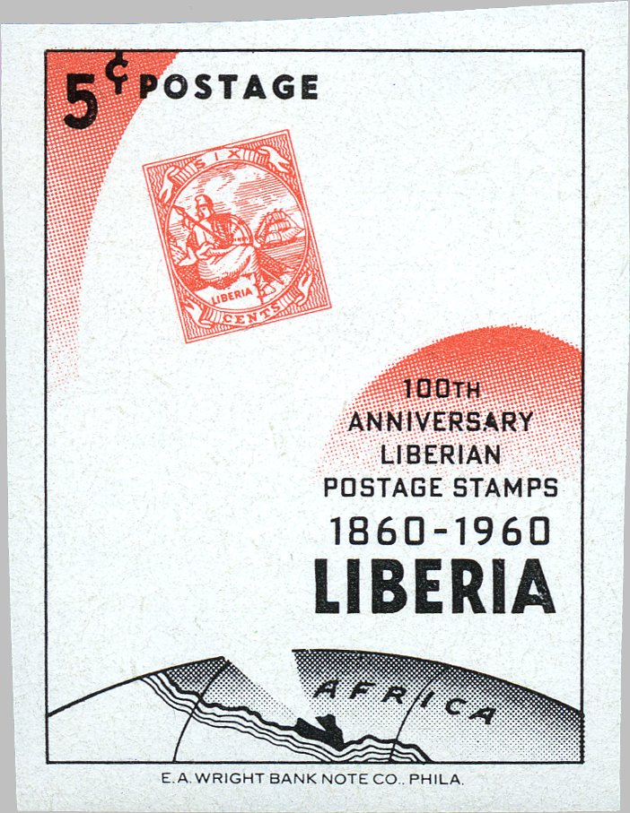 This page contains a loose collection of essays, proofs and specimens of Liberian stamps issued through 1960. About the terminology: essays either show stamp designs that were never used or designs that were used but altered for the final stamp; proofs, whether taken from the whole plate or directly from the single die, always show the final design or parts of it – but often in a different “trial” color and printed on different paper, e.g. cardboard – however, they can also have gum and be perforated like a normal stamp; specimens are the finished stamps as issued, but with overprint to indicate they are meant for distribution to postal authorities or sent as examples to the Universal Postal Union. From this it should be clear that the “Waterlow specimens” of the first pictorial issue printed in trial colors are really proofs.