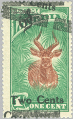type II (1926) “black bar” often made up of two bars of unequal lenght, setting of 5 x 5, in black on regular stamp with variety “TwoCents” lacking space between words (position 2), and, in addition, on official stamp with “Two Gents” spelling error (position 10);