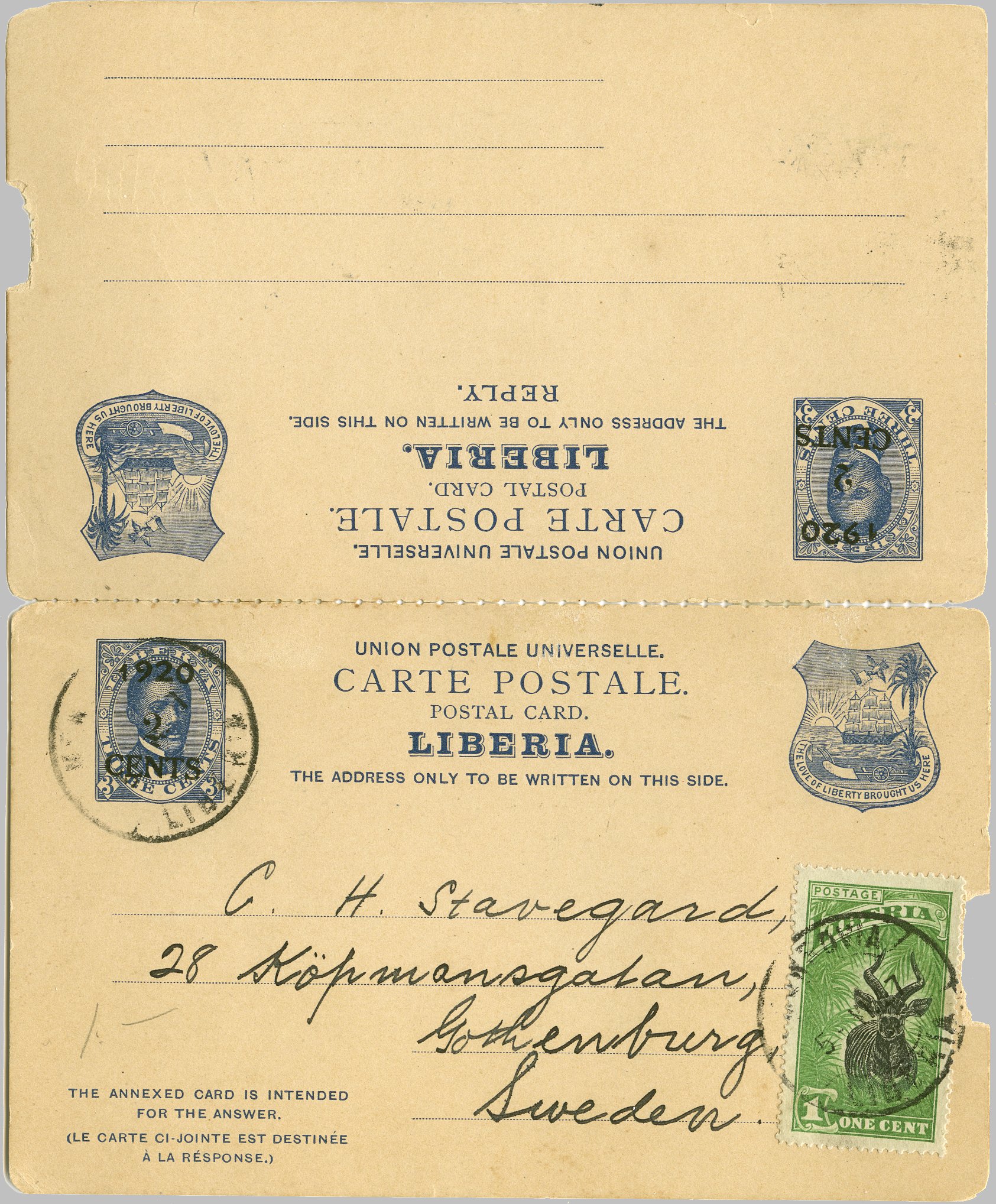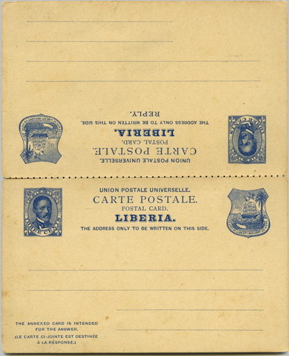 Between 1882 and 1920 Liberia made available the following categories of postal stationery for surface mail: envelopes, newspaper wrappers, letter sheets, post cards, post reply cards, and registered envelopes. From 1948 on, Liberia has issued two categories of airpost stationery: air envelopes and air letter sheets (aerogrammes).