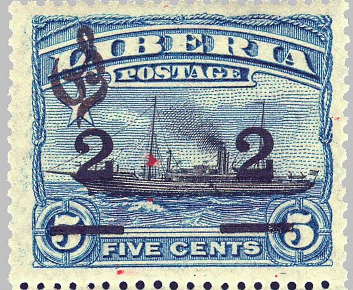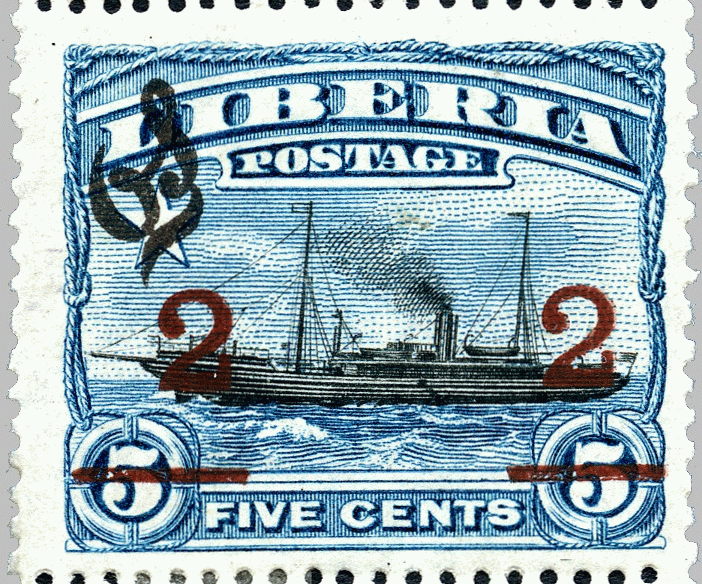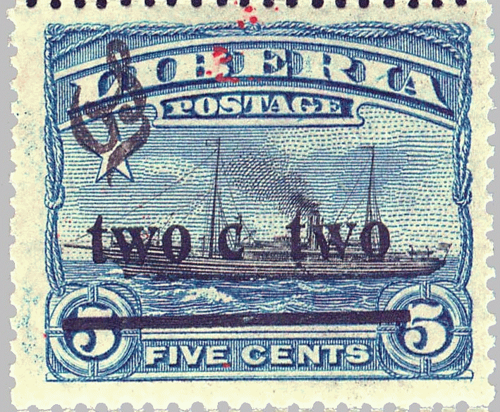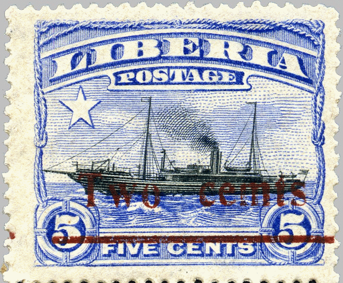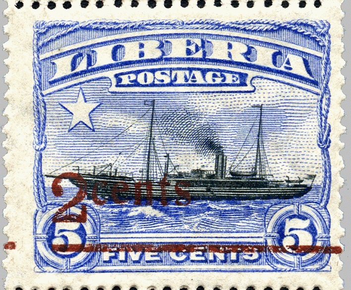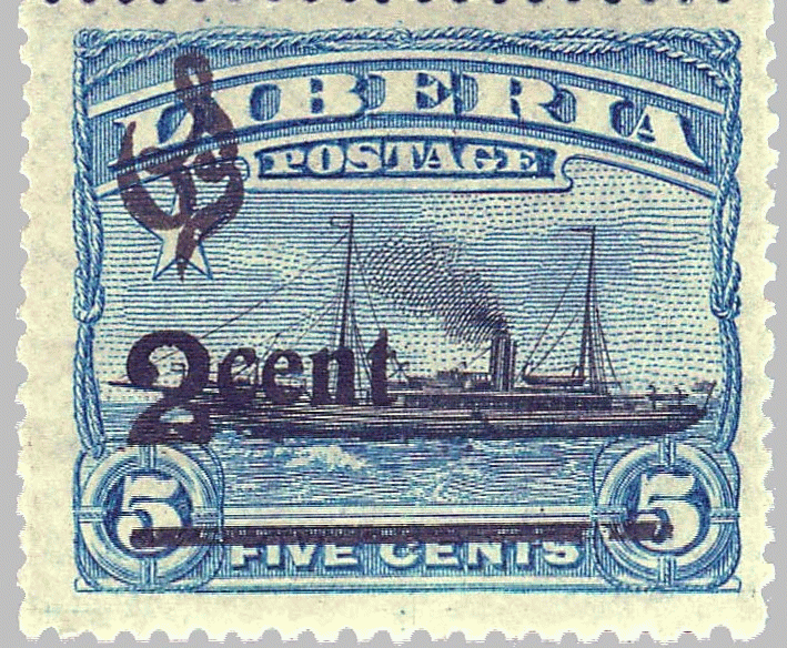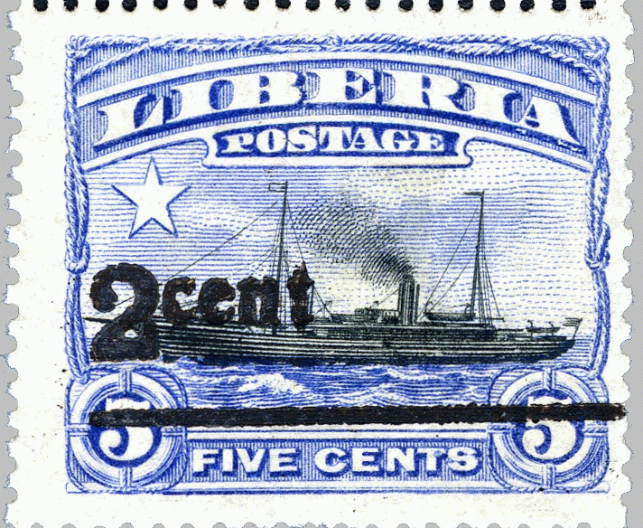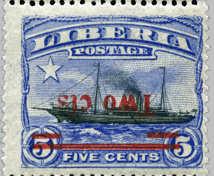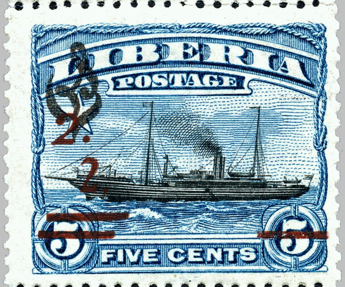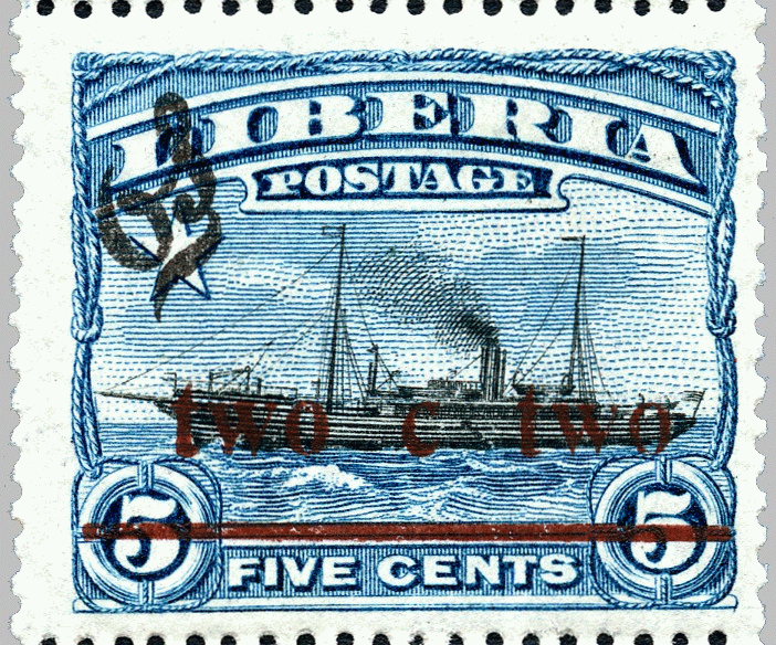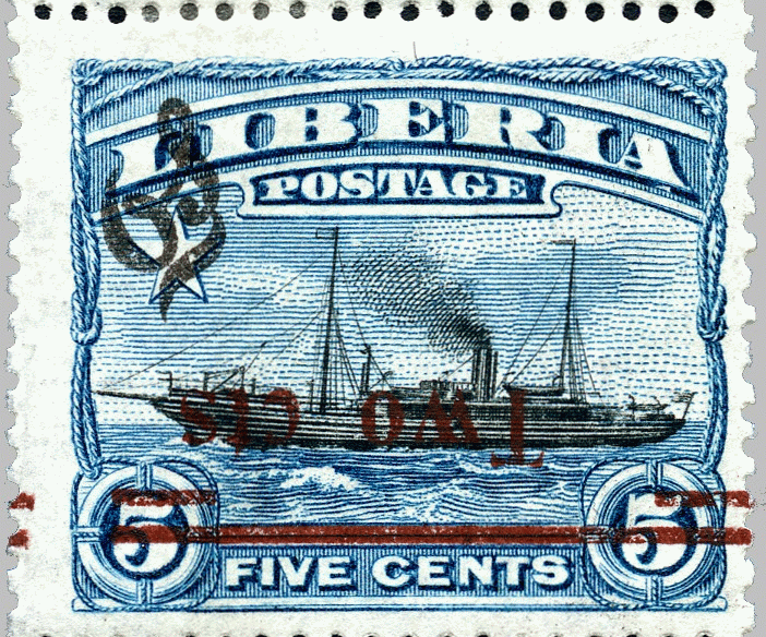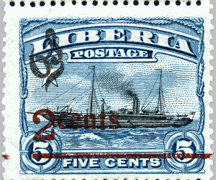 Errors often creep in when stamps are surcharged, but the mistakes usually make the stamps rarer. In this case, taking for example the 5 cents ultramarine and black, show a picture of the Liberian gunboat "Lark," each sheet of 100 stamps contains "errors." Each stamp in the top row of ten bears the red surcharge "Two Cents" with a long red line under it. On each stamp in the second row there are two lines instead of one. The fourth row bears "Two Cts" upside down on each stamp. The eighth row shows 2 2, each figure having a short line under it. The surcharges on the other five rows are all different.