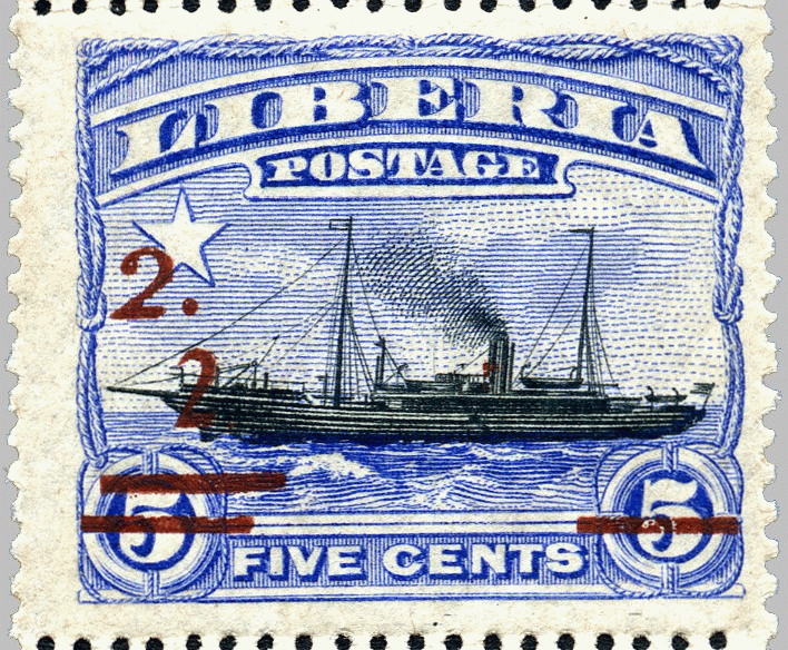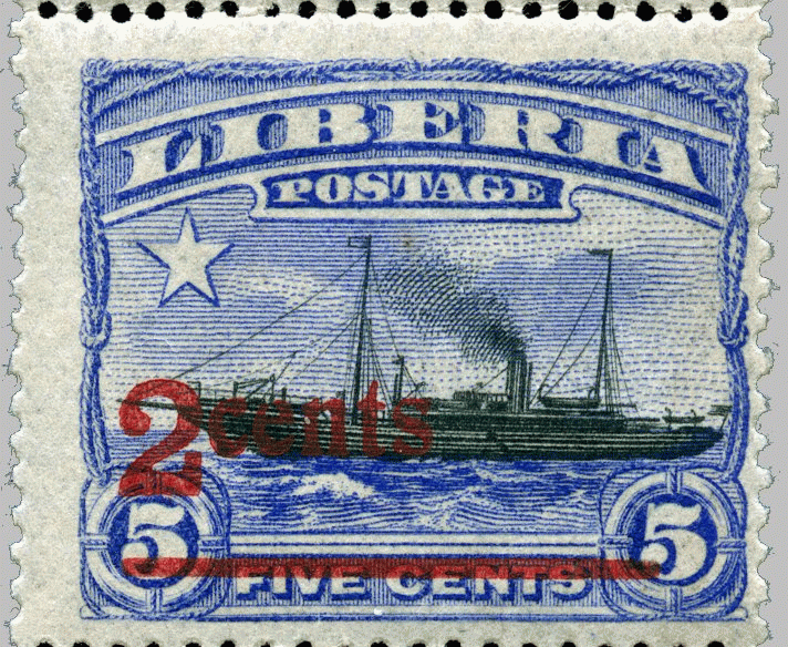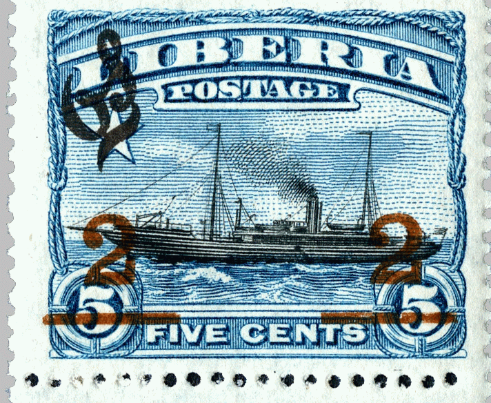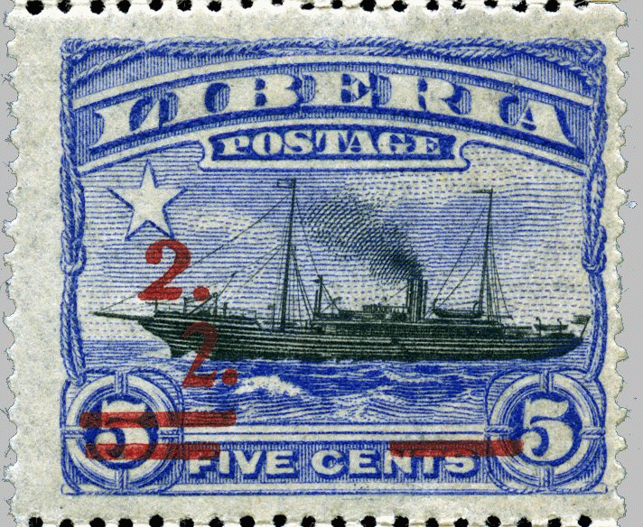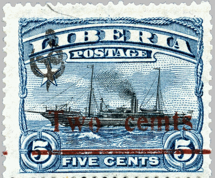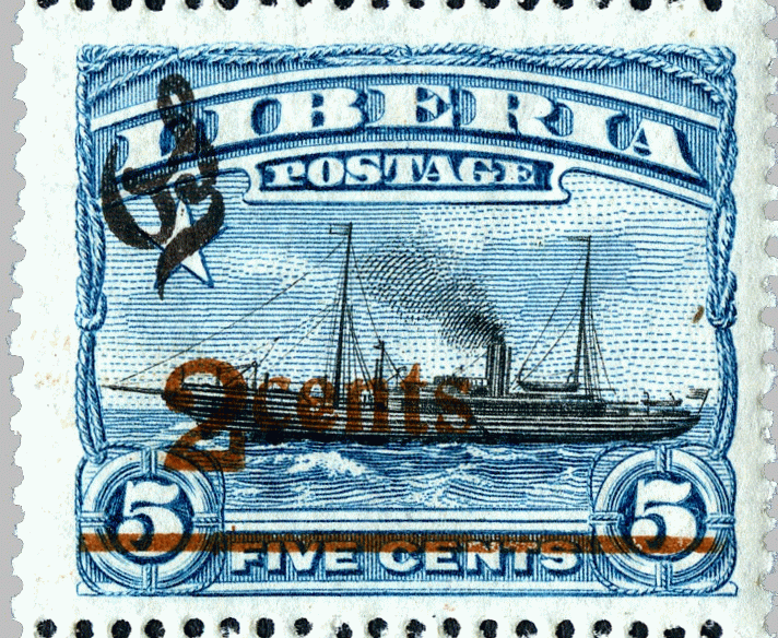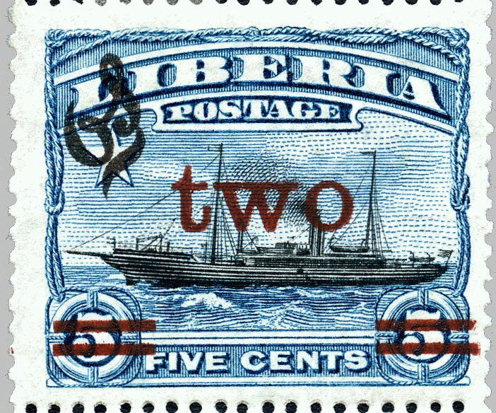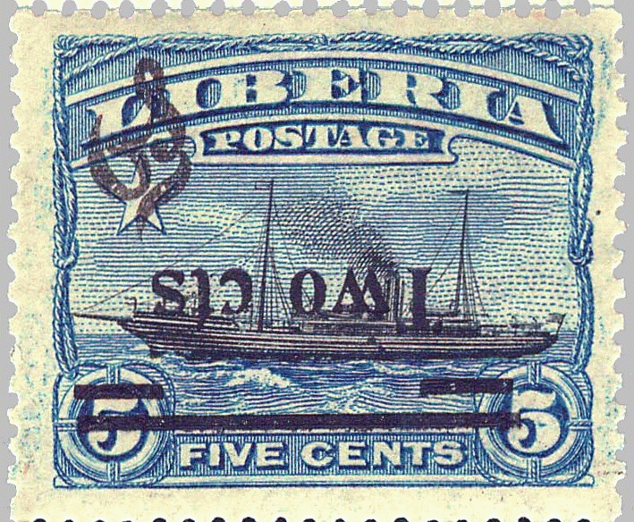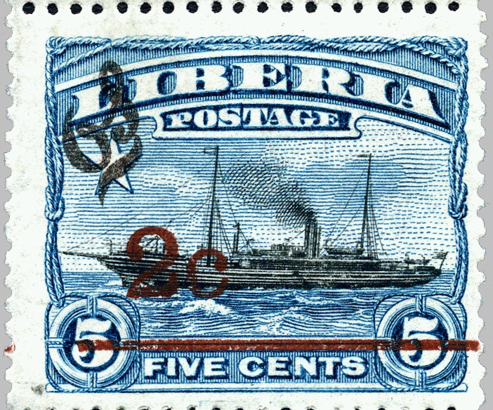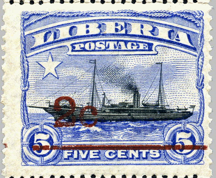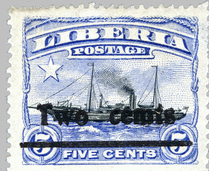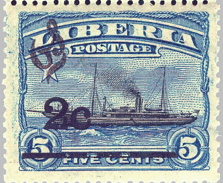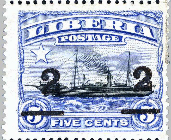 Errors often creep in when stamps are surcharged, but the mistakes usually make the stamps rarer. In this case, taking for example the 5 cents ultramarine and black, show a picture of the Liberian gunboat "Lark," each sheet of 100 stamps contains "errors." Each stamp in the top row of ten bears the red surcharge "Two Cents" with a long red line under it. On each stamp in the second row there are two lines instead of one. The fourth row bears "Two Cts" upside down on each stamp. The eighth row shows 2 2, each figure having a short line under it. The surcharges on the other five rows are all different.