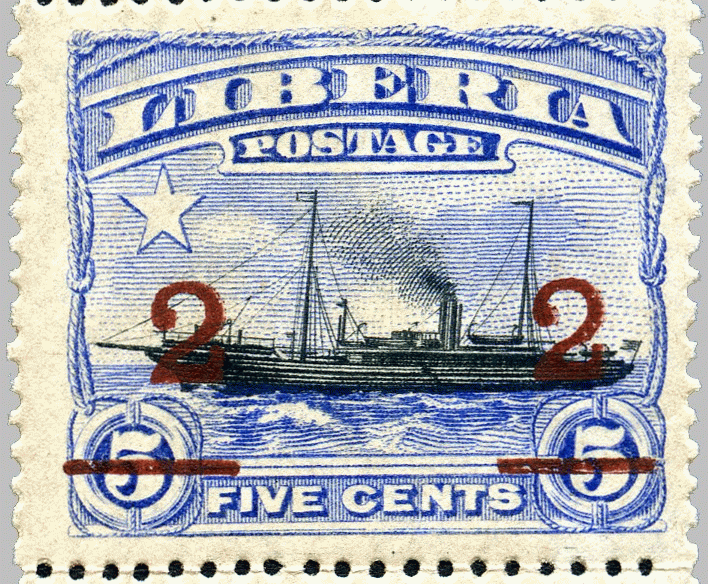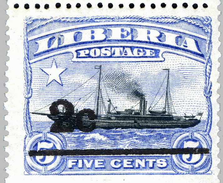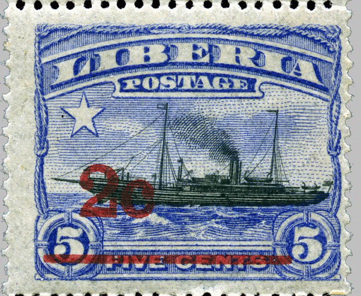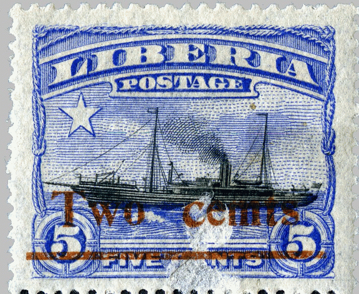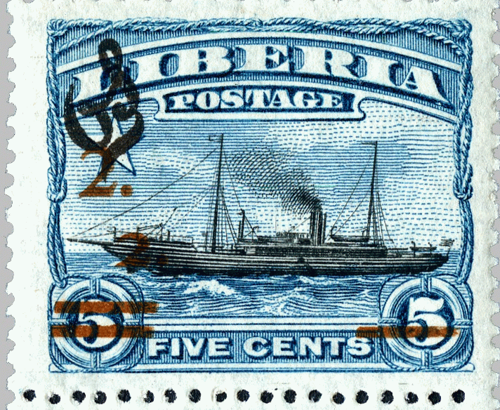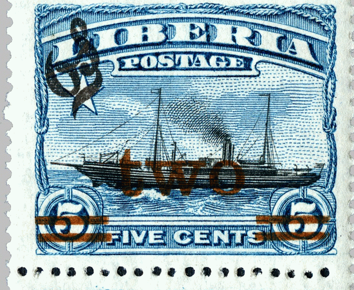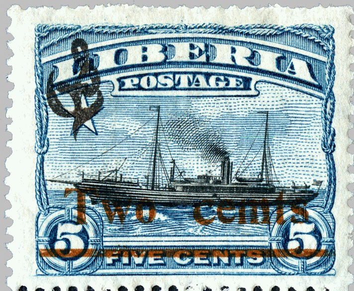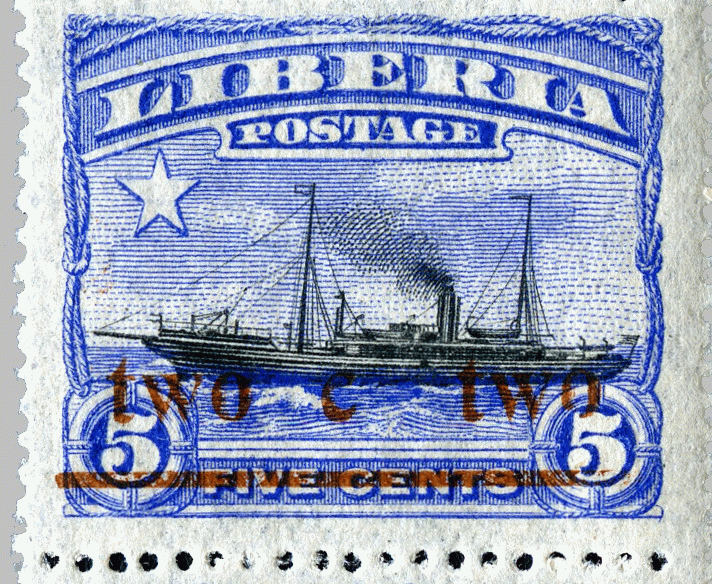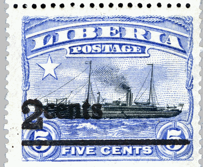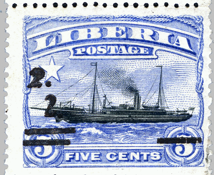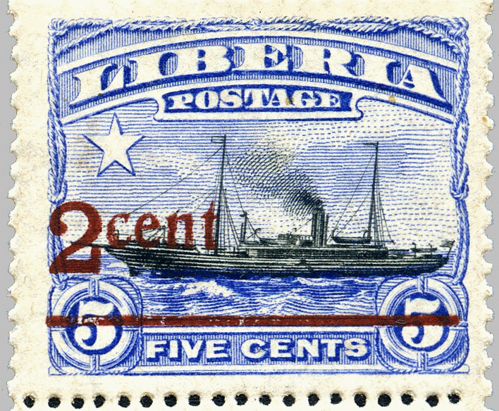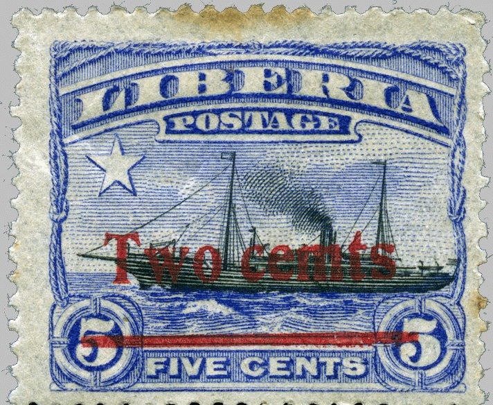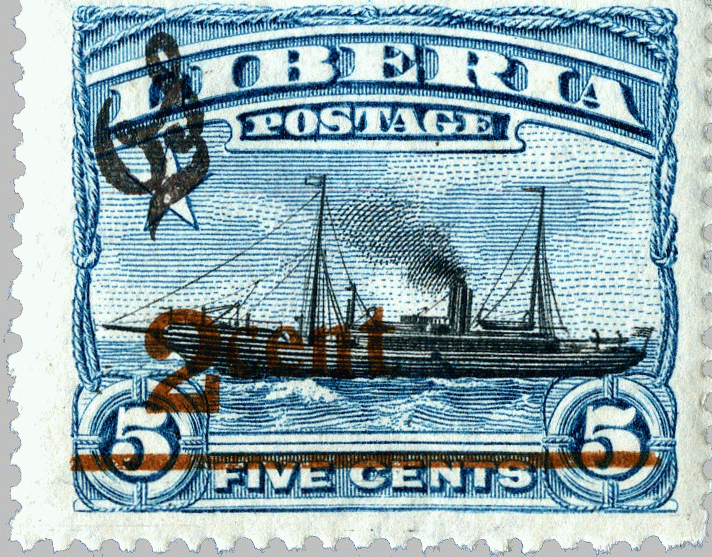 Errors often creep in when stamps are surcharged, but the mistakes usually make the stamps rarer. In this case, taking for example the 5 cents ultramarine and black, show a picture of the Liberian gunboat "Lark," each sheet of 100 stamps contains "errors." Each stamp in the top row of ten bears the red surcharge "Two Cents" with a long red line under it. On each stamp in the second row there are two lines instead of one. The fourth row bears "Two Cts" upside down on each stamp. The eighth row shows 2 2, each figure having a short line under it. The surcharges on the other five rows are all different.